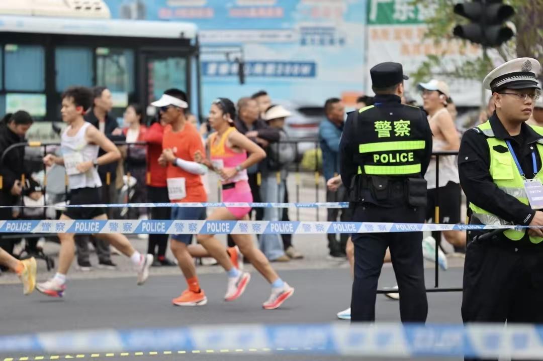賽事過程中,民警們時刻關(guān)注選手狀態(tài),對突發(fā)抽筋、暈倒等情況的參賽選手第一時間實施緊急救助,以“溫情藍(lán)”守護(hù)每一位跑者的安全。