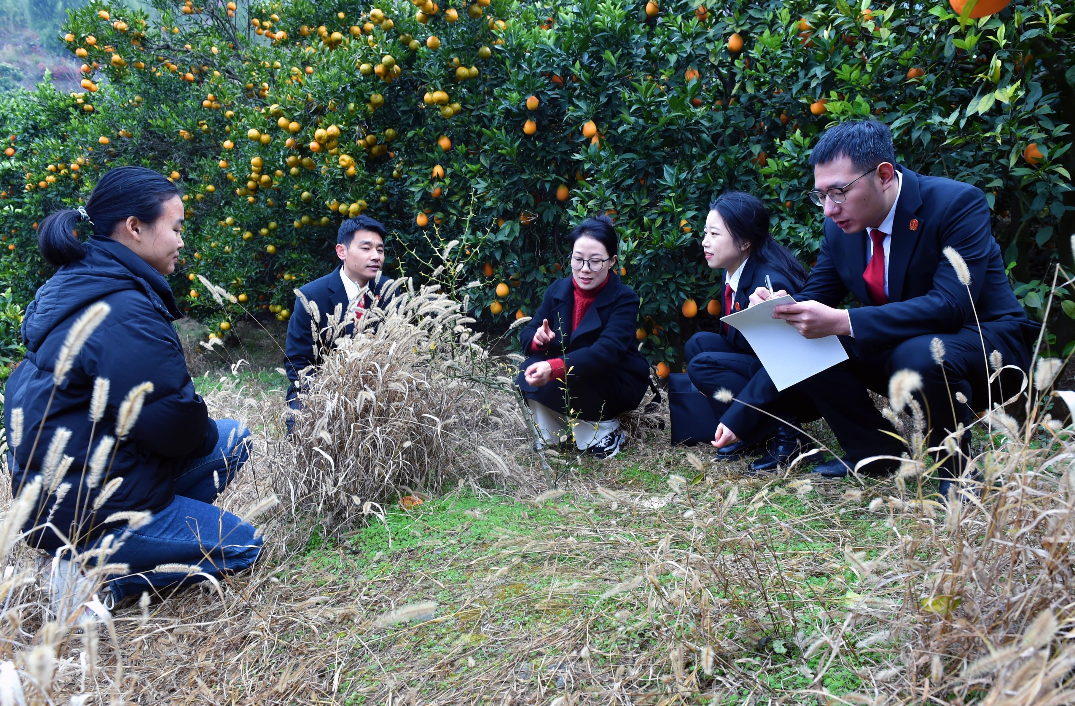 圖為法院干警了解石漠化區(qū)域臍橙種植和土地流轉(zhuǎn)情況。