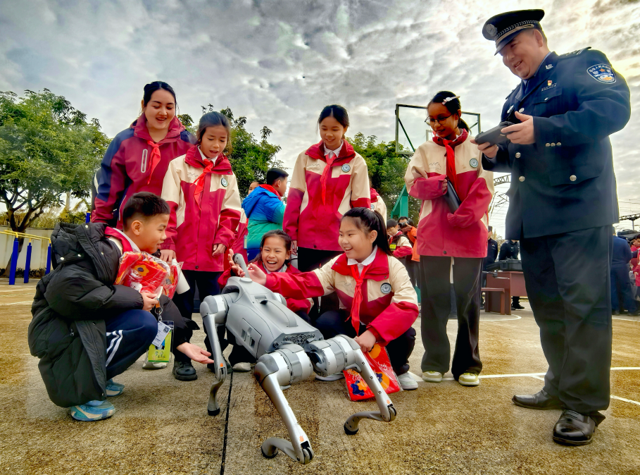 活動(dòng)特別注重法治精神與職業(yè)榮譽(yù)的傳承。全國(guó)公安系統(tǒng)二級(jí)英雄模范、來(lái)賓北站派出所所長(zhǎng)蘇亞偉結(jié)合自身經(jīng)歷,講述從警故事與忠誠(chéng)使命,激發(fā)同學(xué)們的愛(ài)國(guó)情懷與法治意識(shí)?,F(xiàn)場(chǎng),功勛警犬“阿布”的精準(zhǔn)搜爆與警用四足機(jī)器人的智能巡查同臺(tái)演示,詮釋了傳統(tǒng)警務(wù)技能與現(xiàn)代科技應(yīng)用在法治軌道上的深度融合,展現(xiàn)了公安機(jī)關(guān)向科技要警力、發(fā)展新質(zhì)戰(zhàn)斗力的探索。