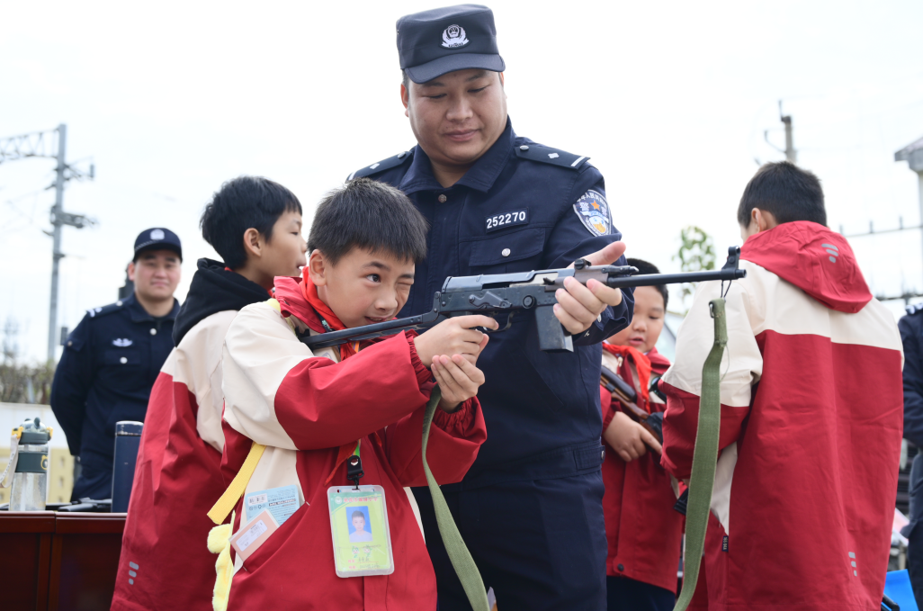 圖為民警指導(dǎo)學(xué)生體驗(yàn)槍支。黃泓琛 攝