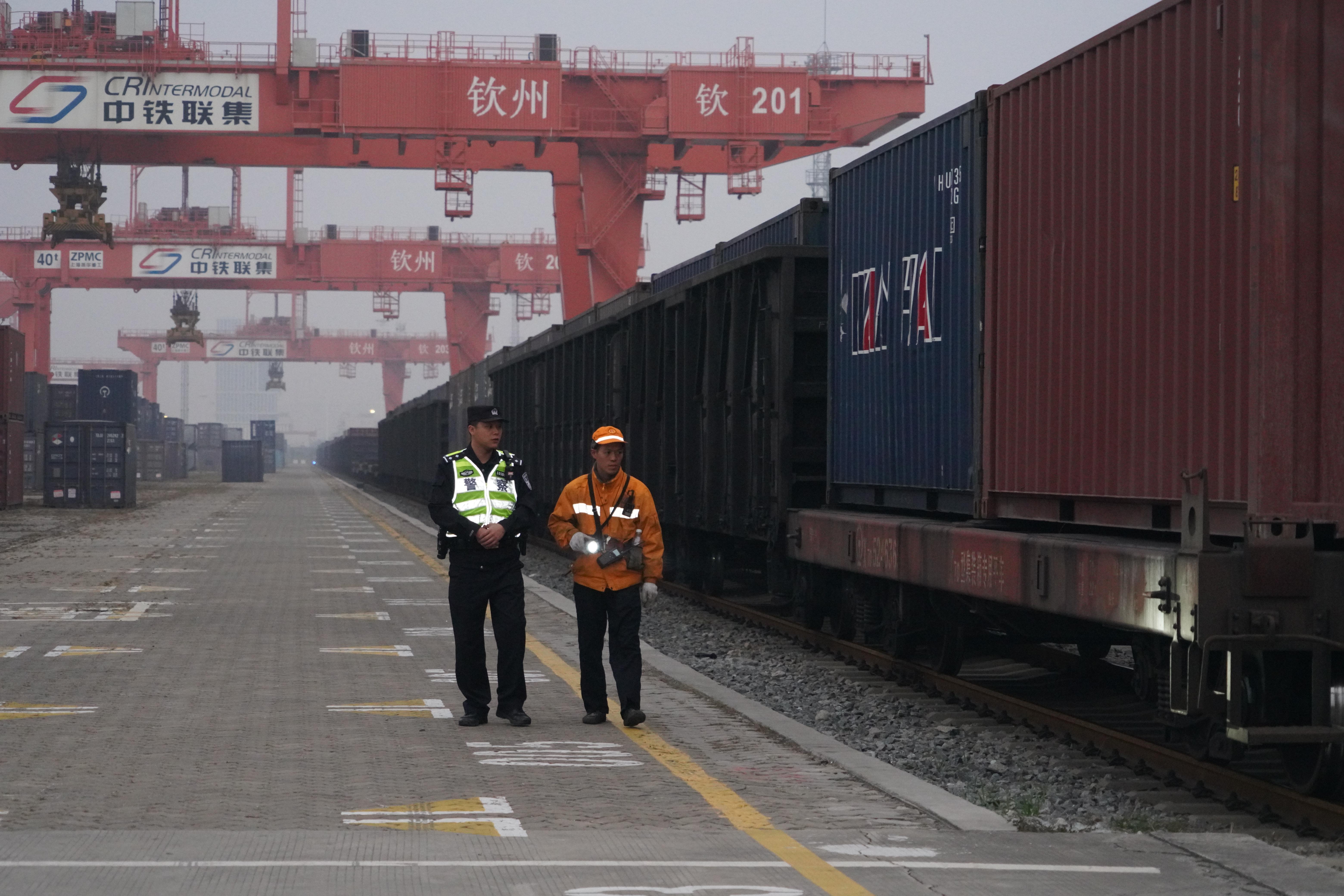 圖為李浩偉和鐵路職工檢查貨場(chǎng)。陳大鵬 攝
