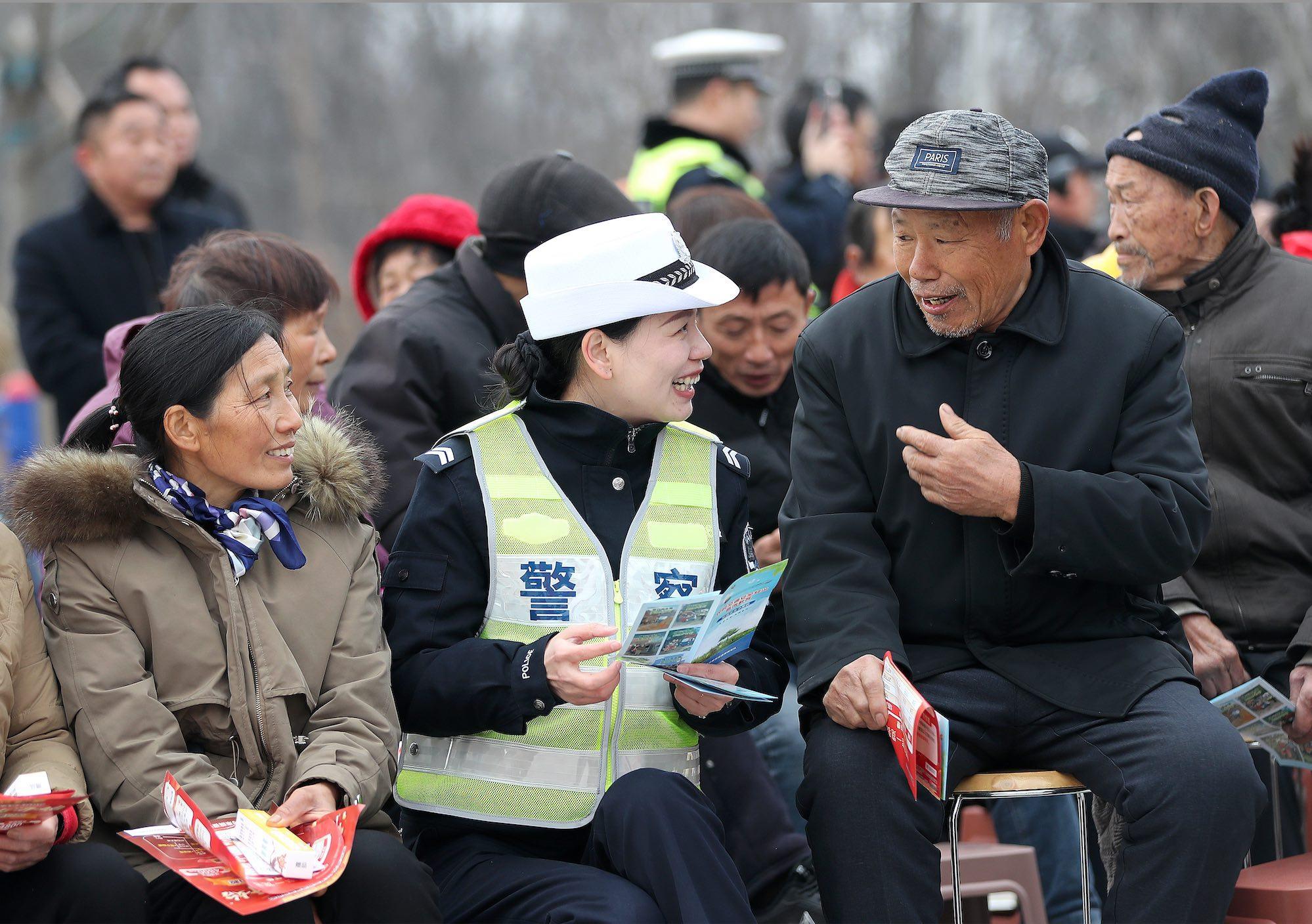 圖為2月6日,荊門市公安局交通管理局民警在漳河鎮(zhèn)團(tuán)坊村農(nóng)民“村晚”文藝活動(dòng)間隙,面對面向村民講解酒駕危害、農(nóng)用車載人隱患等交通安全知識(shí)。