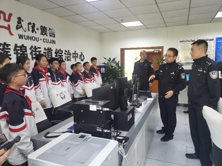 在派出所綜合指揮室,民警向同學(xué)們介紹日常工作運行情況。當同學(xué)們了解到,除了每天有警察巡邏守護外,“天網(wǎng)”也24小時關(guān)注和守護著校園的安全,紛紛向民警表達了感謝。