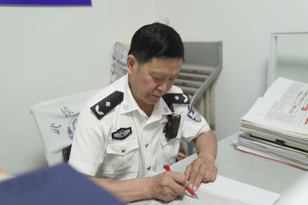 每天早會前,所上的老“國優(yōu)”、社區(qū)警務(wù)隊民警郭學(xué)彬在辦公桌前翻看工作筆記本,本上認(rèn)認(rèn)真真手寫記錄著每日工作、例會內(nèi)容、重點任務(wù)、完成情況……他逐頁翻看更新,對照完成進度“銷賬”。