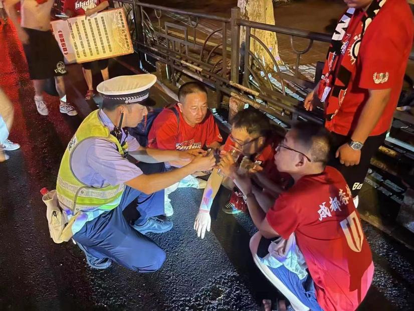 當晚23時20分許,比賽結束后,樂山市公安局交警支隊直屬一大隊牛咡橋中隊交警馬濤和王飛仍堅守在市中區(qū)新廣場執(zhí)勤點巡邏執(zhí)勤,發(fā)現(xiàn)一名剛剛從擺渡車上下來的球迷突然摔倒在地。
