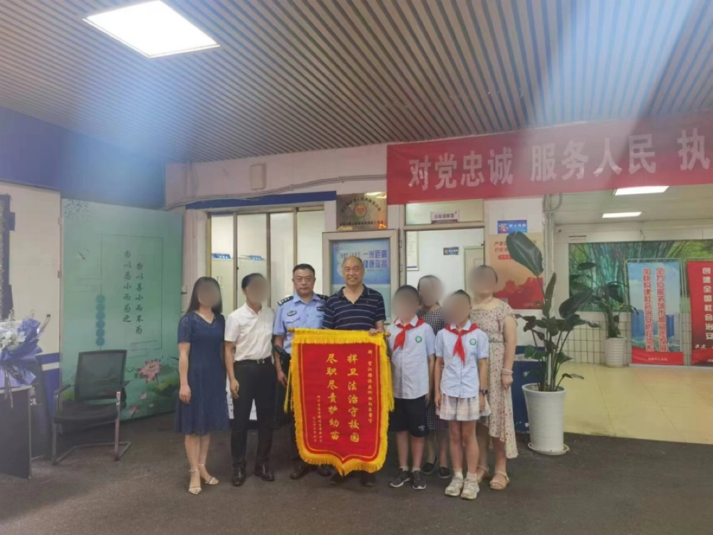 老師和孩子們給白警官送上寫(xiě)著“捍衛(wèi)法制守校園、盡職盡責(zé)護(hù)幼苗”的錦旗,感謝他與派出所其他民警幾十年如一日細(xì)致入微的護(hù)校安園工作,確保了學(xué)校師生的安全。
