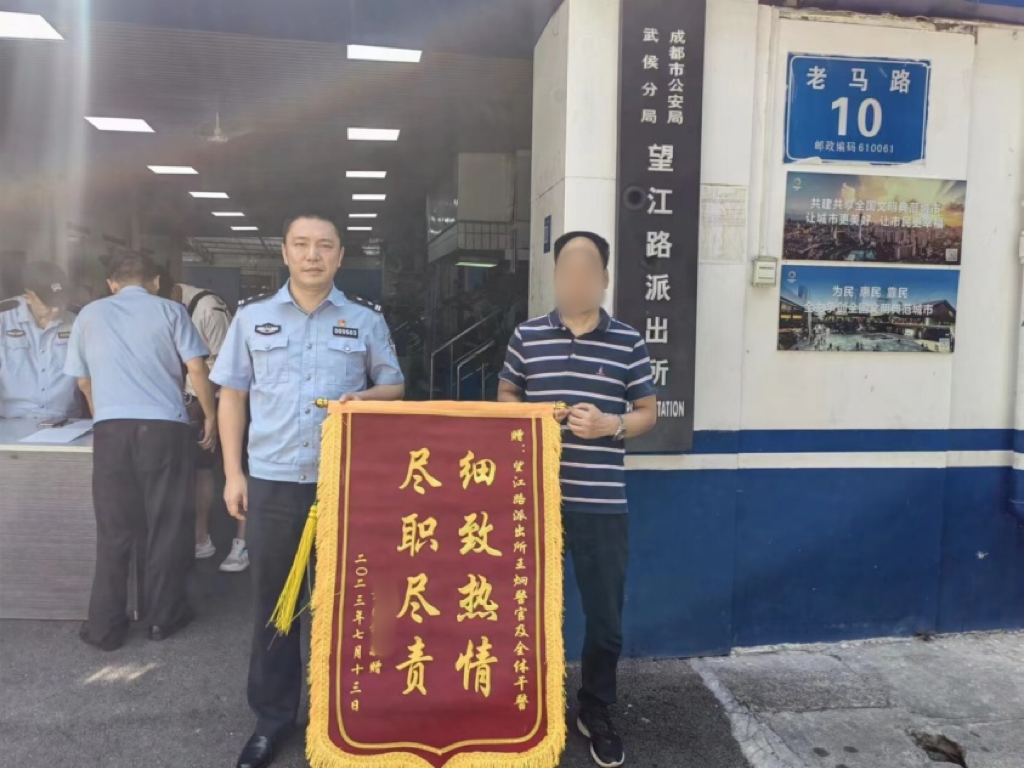 “謝謝警察同志,這么快就幫我把手機(jī)找回來(lái)了!”近日,方先生將一面印有“細(xì)致熱情 盡職盡責(zé)”的錦旗送到了望江路派出所教導(dǎo)員彭偉手中,對(duì)派出所民警快速為其追回手機(jī)表示誠(chéng)摯感謝。