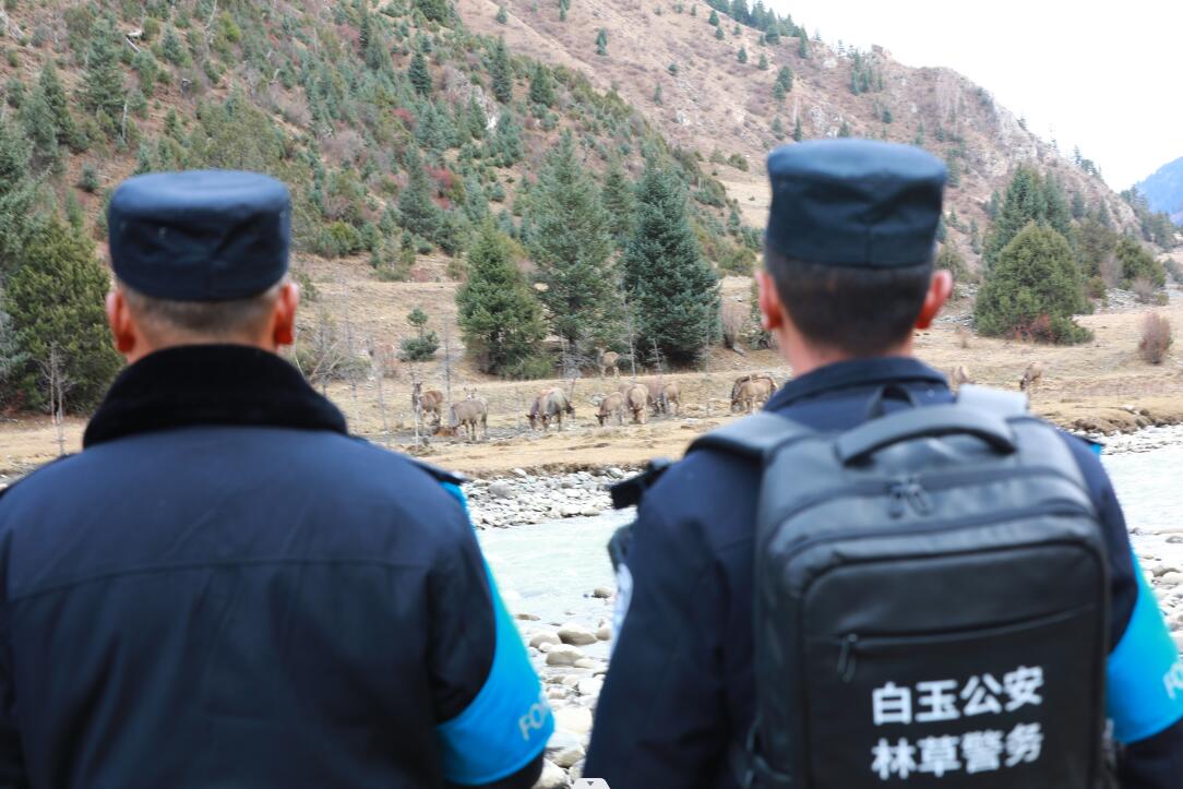 近日,四川省甘孜州白玉縣公安局森警大隊和安孜派出所民輔警聯(lián)合巡山途中,在麻絨鄉(xiāng)察青松多自然保護(hù)區(qū)偶遇上百只下山喝水覓食的國家一級保護(hù)野生動物白唇鹿。