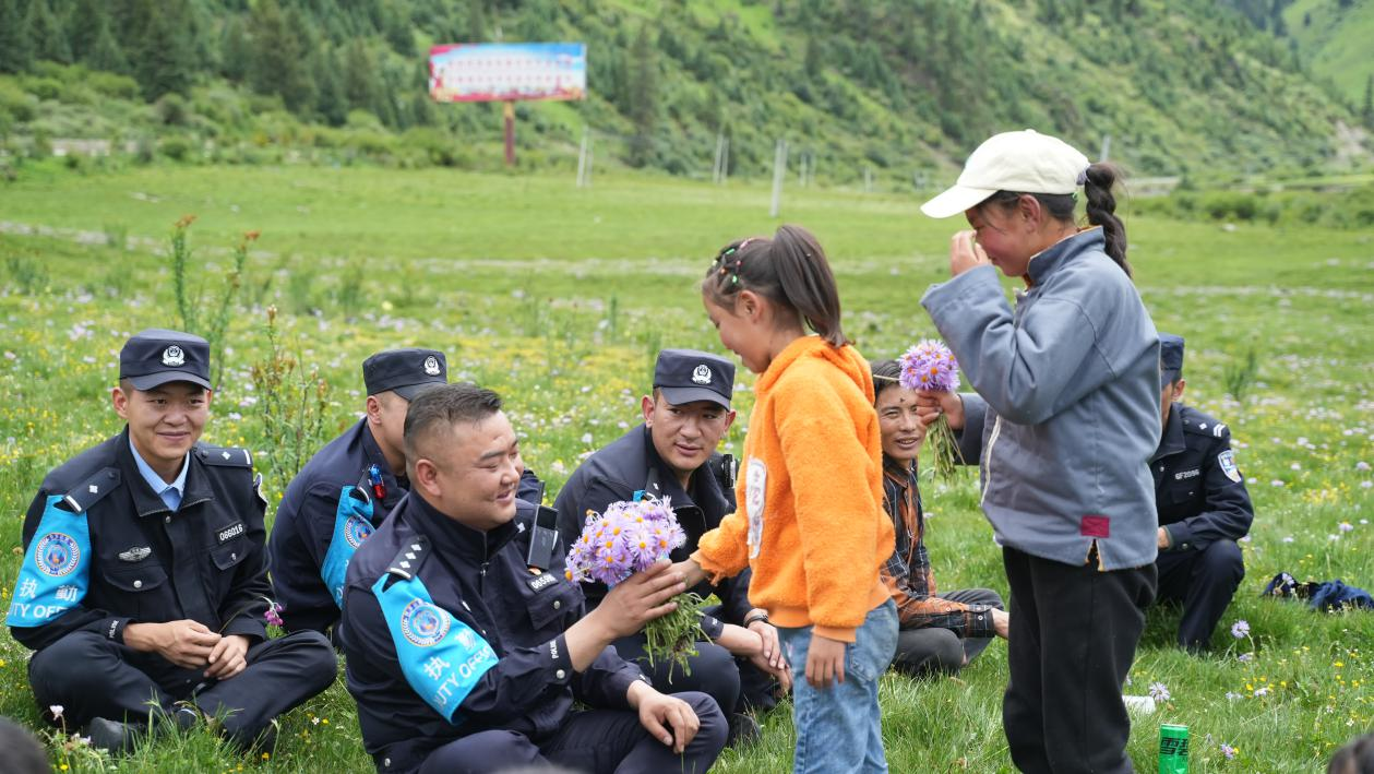 他要求派出所大門24小時都為群眾敞開,保證服務不缺位;為找到牧民丟失的牦牛,他帶領戰(zhàn)友兩天兩夜翻雪山,住牛棚,贏得原創(chuàng)《雪域之光》MV的禮贊;為保護牧民牦牛不被野狼侵擾,他帶領戰(zhàn)友徹夜守護。真心一定可以換來民心。寒冬時節(jié),群眾為派出所送來取暖用的牛糞;盛夏時節(jié),孩子們?yōu)樗蛠碛H手采摘的花環(huán);花海中的黑帳篷,是他最美的偶遇;轄區(qū)群眾最擔心的事,就是害怕他調走......這就是對為民快要禿了頭的“小高”所長追光路上最好的禮遇。
