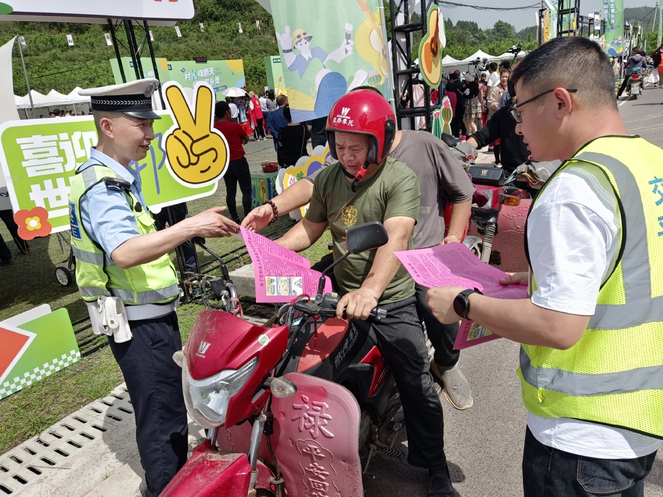 “大叔,您好!鄉(xiāng)村道路駕駛電動車請一定登記上戶,正確佩戴安全頭盔哈,這是交通安全宣傳資料,請收好仔細(xì)閱讀。”