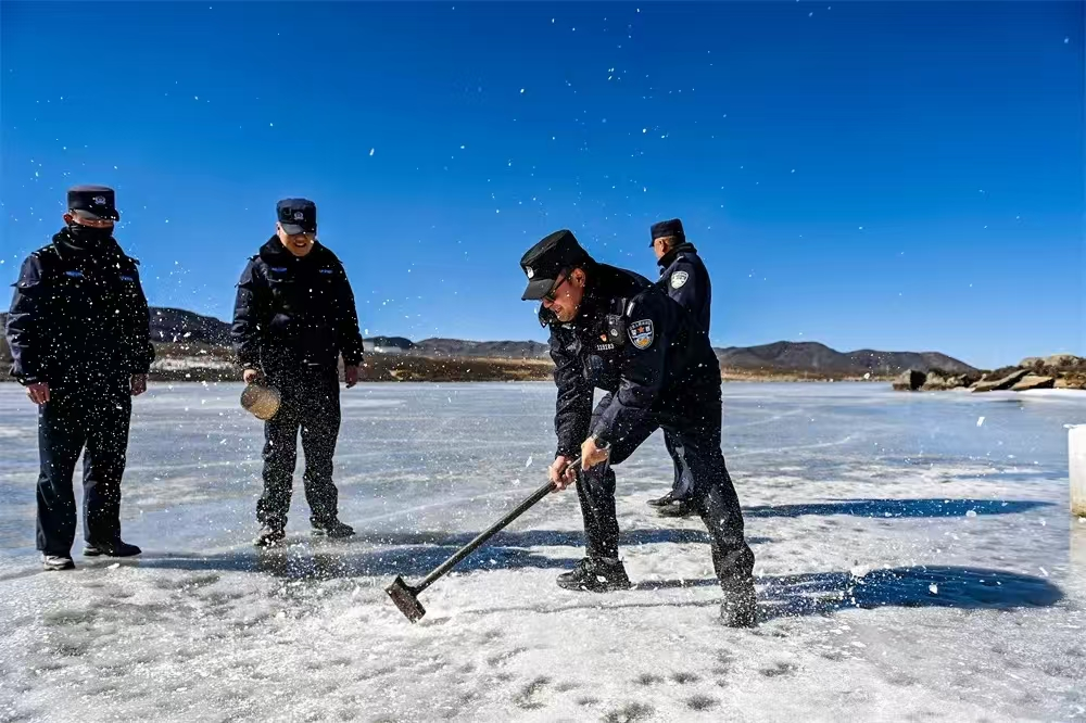 中午時(shí)分,土登郎加又和大家一起前往警務(wù)站不遠(yuǎn)處的措拉湖里取水,警務(wù)站不通水,大家的生活用水都是從這個(gè)海子里提取的。每到冬季,海子的水面就會(huì)結(jié)冰,堅(jiān)固的冰面能夠通行汽車。只有到了中午,氣溫開(kāi)始回升,冰層融化了一些,大家找到結(jié)冰薄一點(diǎn)的地方,使勁用鐵錘鑿開(kāi)一個(gè)窟窿,才能取到冰面下的水。