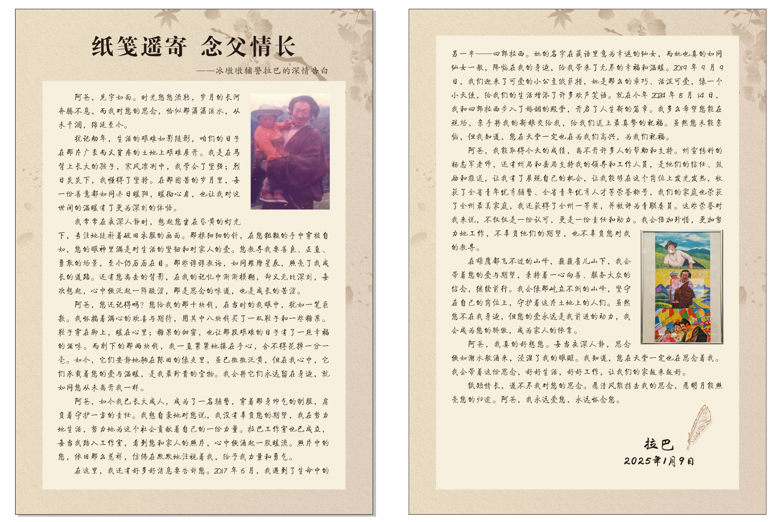 “阿爸,見字如面。時光悠悠流轉,歲月的長河奔騰不息,而我對您的思念,恰似那潺潺溪水,從未干涸,綿延至今。我常常在夜深人靜時,想起您坐在昏黃的燈光下,專注地縫補著破舊衣服的畫面。那根細細的針,在您粗糙的手中穿梭自如,您的眼神里滿是對生活的堅韌和對家人的愛。您教導我要善良、正直、勇敢的場景,至今仍歷歷在目。那些諄諄教誨,如同璀璨星辰,照亮了我成長的道路。阿爸,您還記得嗎?您給我的那十塊錢,在當時的我眼中,猶如一筆巨款。我懷揣著滿心的歡喜與期待,用其中八塊錢買了一雙鞋子和一些糖果。鞋子穿在腳上,暖在心里;糖果的甜蜜,也讓那段艱難的日子有了一絲幸福的滋味。而剩下的那兩塊錢,我一直緊緊地攥在手心,舍不得花掉一分一毫。如今,它們安靜地躺在陳舊的像夾里,雖已微微泛黃,但在我心中,它們承載著您的愛與溫暖,是我最珍貴的寶物。我會將它們永遠留在身邊,就如同您從未離開我一樣。在這里,我還有好多好消息要告訴您。2017年6月,我遇到了生命中的另一半——四郎拉西。她的名字在藏語里意為幸運的仙女,而她也真的如同仙女一般,降臨在我的身邊,給我?guī)砹藷o盡的幸福和溫暖。2019年9月9日,我們迎來了可愛的小公主俄薩措,她是那么的乖巧、活潑可愛,像一個小天使,給我們的生活增添了許多歡聲笑語。在雄鷹都飛不過的山峰,巍巍雀兒山下,我會帶著您的愛與期望,秉持著一心向善、服務大眾的信念,繼續(xù)前行。我會像那屹立不倒的山峰,堅守在自己的崗位上,守護著這片土地上的人們。雖然您不在我身邊,但您的愛永遠是我前進的動力,我會成為您的驕傲,成為家人的依靠?!边@是一封來自德格縣的輔警拉巴寫給父親的信,信件以樸素的詞匯表達了對已故父親的思念,以及自己將謹遵父親教誨,努力在崗位上發(fā)光發(fā)熱的決心。