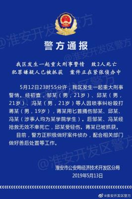 法制網(wǎng)訊 記者羅莎莎 @淮安開發(fā)區(qū)警方官方微博5月13日發(fā)布通報,5月12日23時55分許,該區(qū)發(fā)生一起重大刑事警情。經(jīng)初查,鄒某(男,21歲)、邱某(男21歲)、馮某(男,21歲)等人因瑣事糾紛毆打蔣某(男,19歲),蔣某用匕首捅傷鄒某、邱某、馮某(涉事人均為某學(xué)院學(xué)生)。后鄒某、馮某經(jīng)搶救無效不幸死亡,邱某受輕傷。目前,蔣某已被抓獲,警方正積極做好案件偵辦,配合相關(guān)部門做好善后處置等工作。