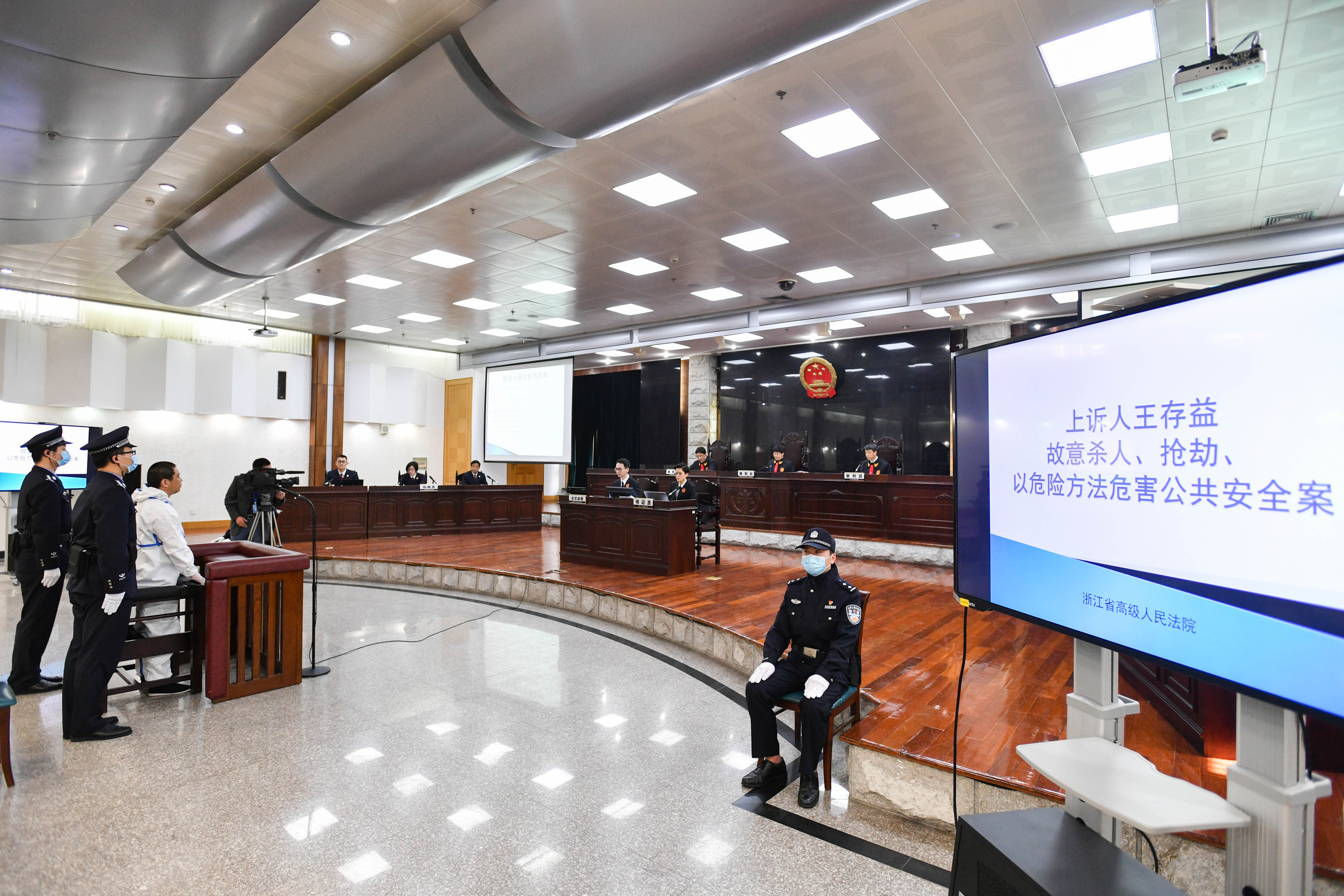 今年4月17日上午,浙江省高級(jí)人民法院二審公開開庭審理了王存益故意殺人、搶劫、以危險(xiǎn)方法危害公共安全案。浙江省人民檢察院檢察長(zhǎng)、二級(jí)大檢察官賈宇與檢察員黃茜霞、李明出庭履行職務(wù),浙江高院副院長(zhǎng)陳志君擔(dān)任審判長(zhǎng),法官梁健、侯天柱擔(dān)任審判員,上訴人王存益及其二審辯護(hù)人出庭參加訴訟。