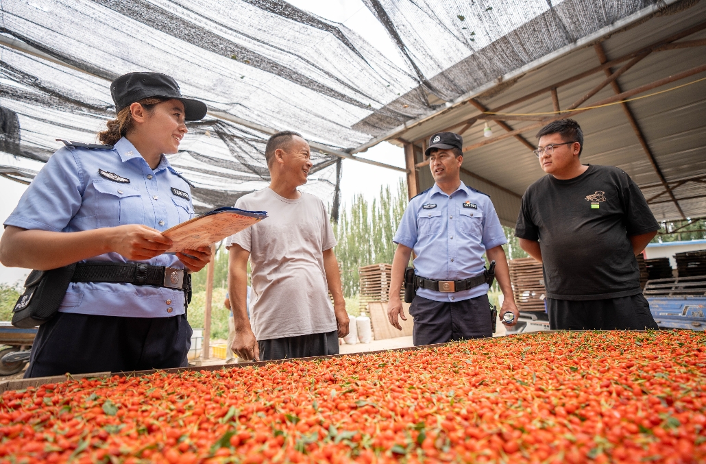新疆葉城縣江格勒斯鄉(xiāng)的百畝枸杞田碩果滿枝,一串串紅潤的枸杞掛滿枝頭,格外誘人。7月15日,葉城縣公安局結(jié)合轄區(qū)實際,采取有效措施,把警務(wù)工作融入鄉(xiāng)村振興,深耕“民生警務(wù)”“服務(wù)警務(wù)”,以保農(nóng)、護農(nóng)、利農(nóng)為目標(biāo),主動開展治安巡邏、交通管理、安全宣傳、防火及服務(wù)群眾等工作,全方位、多渠道為枸杞采摘保駕護航。
