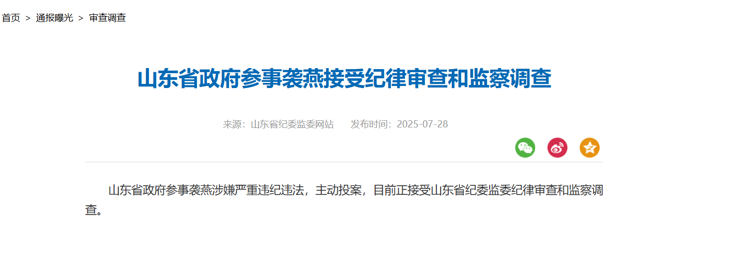 7月28日,據(jù)山東省紀委監(jiān)委網(wǎng)站消息,山東省政府參事襲燕涉嫌嚴重違紀違法,主動投案,目前正接受山東省紀委監(jiān)委紀律審查和監(jiān)察調查。
