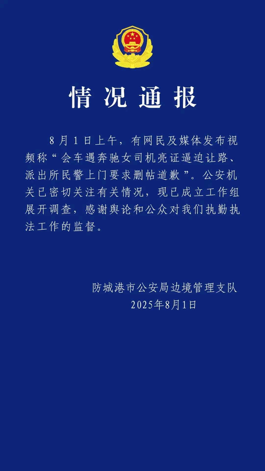 8月1日晚,防城港市公安局邊境管理支隊(duì)發(fā)布情況通報(bào):8月1日上午,有網(wǎng)民及媒體發(fā)布視頻稱“會車遇奔馳女司機(jī)亮證逼迫讓路、派出所民警上門要求刪帖道歉”。公安機(jī)關(guān)已密切關(guān)注有關(guān)情況,現(xiàn)已成立工作組展開調(diào)查,感謝輿論和公眾對我們執(zhí)勤執(zhí)法工作的監(jiān)督。