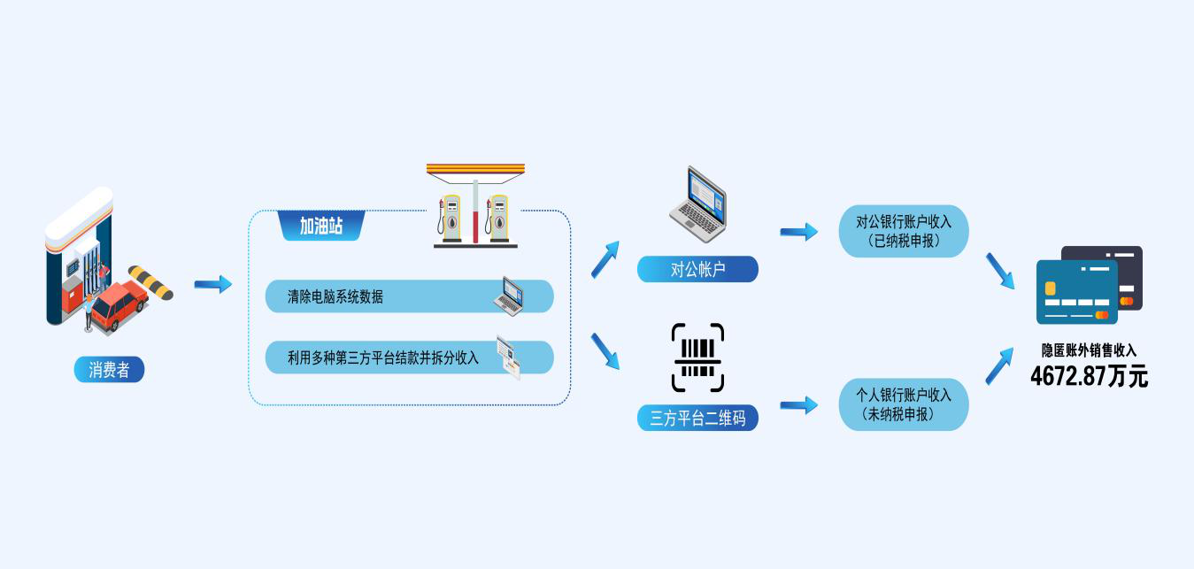 經(jīng)進(jìn)一步調(diào)查,該加油站實(shí)際上綁定了兩個(gè)第三方支付平臺(tái),雖然平臺(tái)交易記錄僅保留部分月份的收款金額,但這些金額遠(yuǎn)遠(yuǎn)大于加油站日常申報(bào)金額。至此,檢查人員初步掌握了該加油站隱匿銷(xiāo)售收入、未依法申報(bào)的證據(jù)。