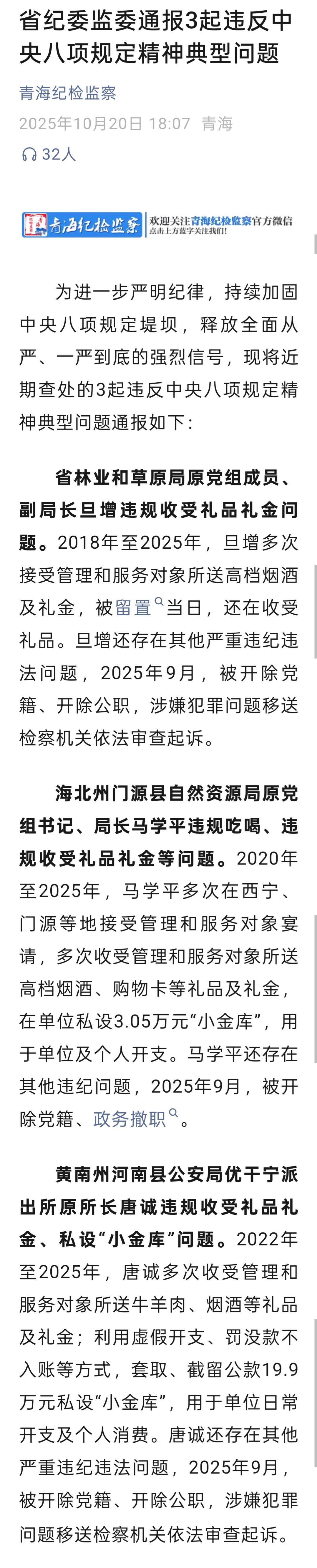 為進(jìn)一步嚴(yán)明紀(jì)律,持續(xù)加固中央八項(xiàng)規(guī)定堤壩,釋放全面從嚴(yán)、一嚴(yán)到底的強(qiáng)烈信號(hào),10月20日,青海省紀(jì)委監(jiān)委通報(bào)近期查處的3起違反中央八項(xiàng)規(guī)定精神典型問(wèn)題。