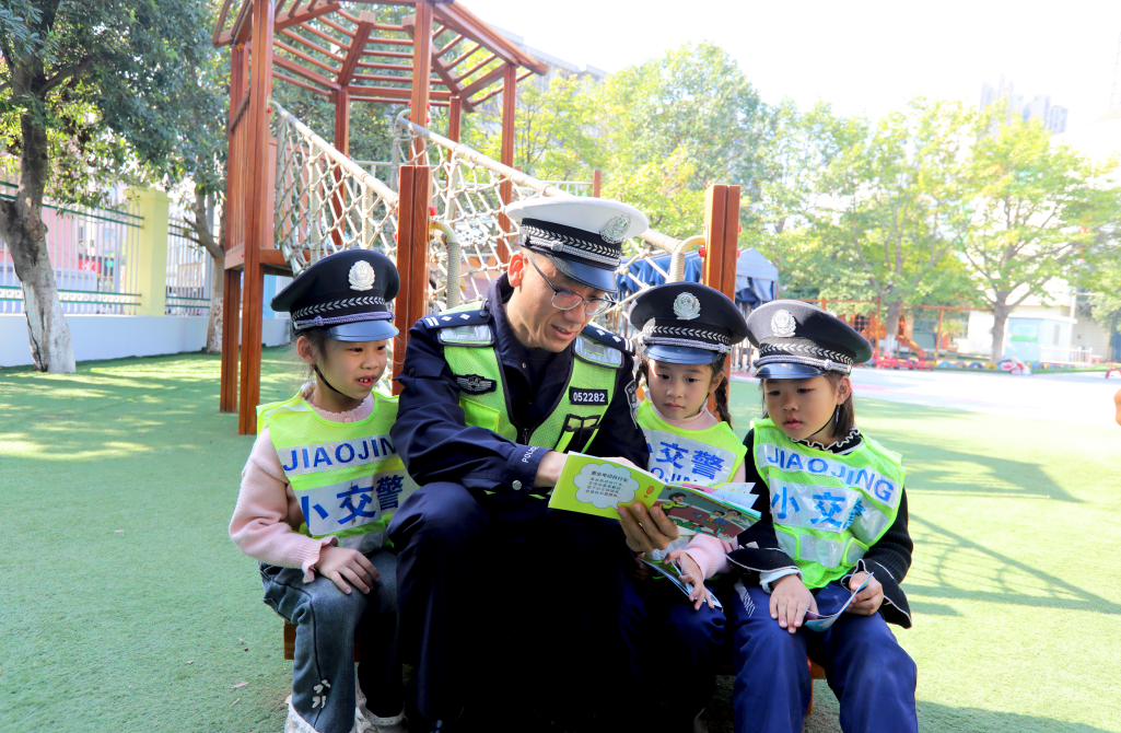 圖為12月1日,民警在分宜縣中心幼兒園向小朋友講解交通安全知識。