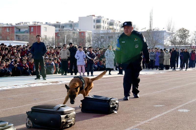 另一邊,警犬演示區(qū)域同樣人氣爆棚。訓(xùn)導(dǎo)員帶著訓(xùn)練有素的警犬登場,瞬間吸引了全體師生的目光。在訓(xùn)導(dǎo)員的指令下,警犬依次展示了服從指令、搜爆排查等科目,動作迅猛精準(zhǔn)、配合默契無間。演示過程中,訓(xùn)導(dǎo)員還向同學(xué)們講解了警犬的品種、訓(xùn)練日常,不少同學(xué)主動提問,近距離觀察警犬,感受人與犬之間的默契與堅守,現(xiàn)場掌聲此起彼伏。