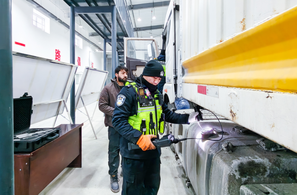 圖為執(zhí)勤民警查驗過往貨車車體。