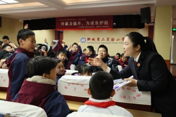 圖為聊城市人民檢察院檢察官走進(jìn)第二實(shí)驗(yàn)小學(xué),進(jìn)行“對暴力說不,為成長護(hù)航”有獎問答。