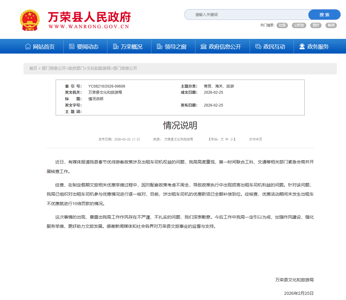 針對此事,2月25日,山西省萬榮縣文旅局發(fā)布情況說明: