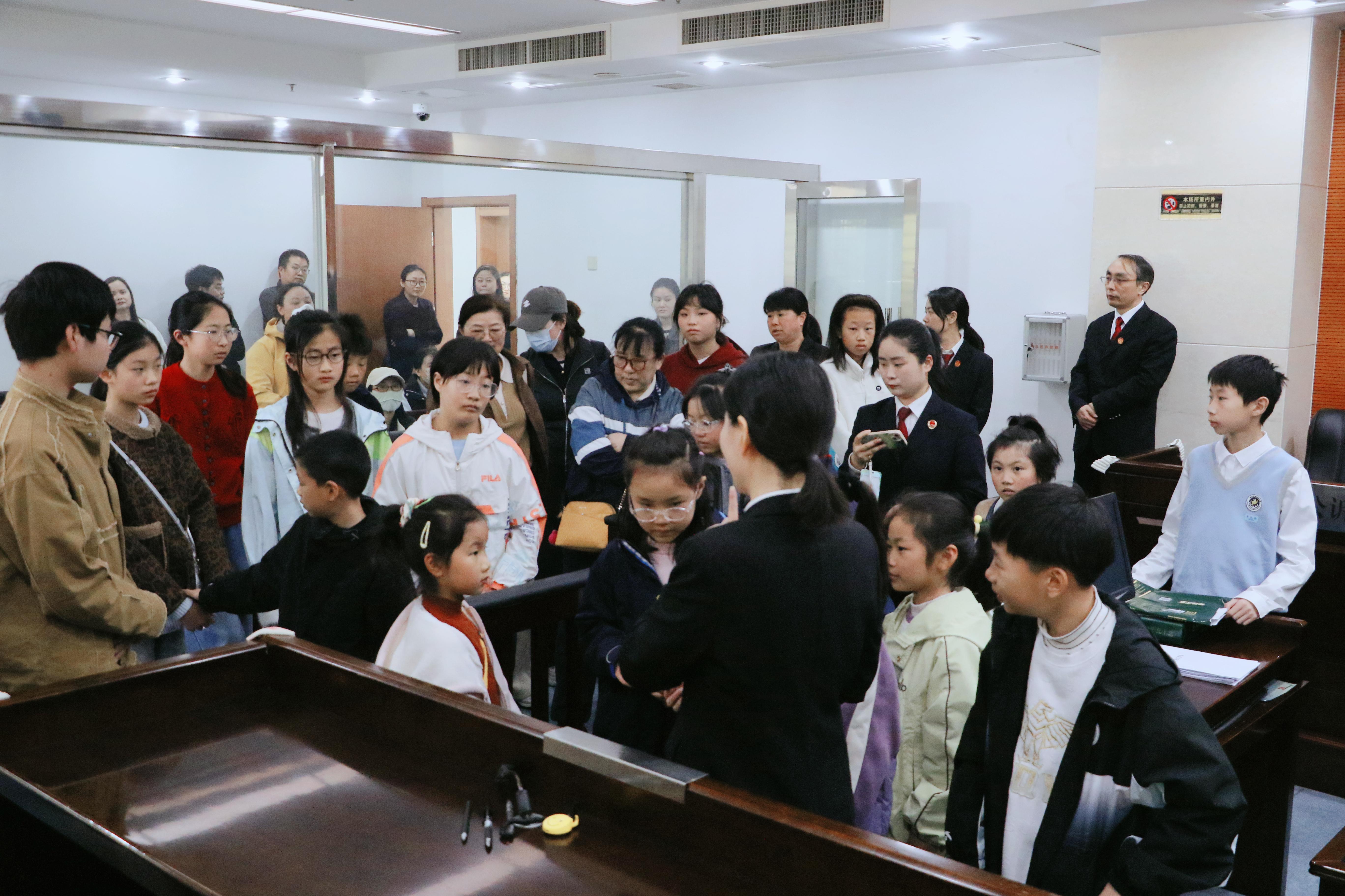 “法徽上的天平代表公平正義!”在棲霞區(qū)人民法院,同學們在法官的帶領下參觀了訴訟服務中心、審判法庭等辦公場所,直觀了解了司法案件辦理全過程,“零距離”接受法治教育。
