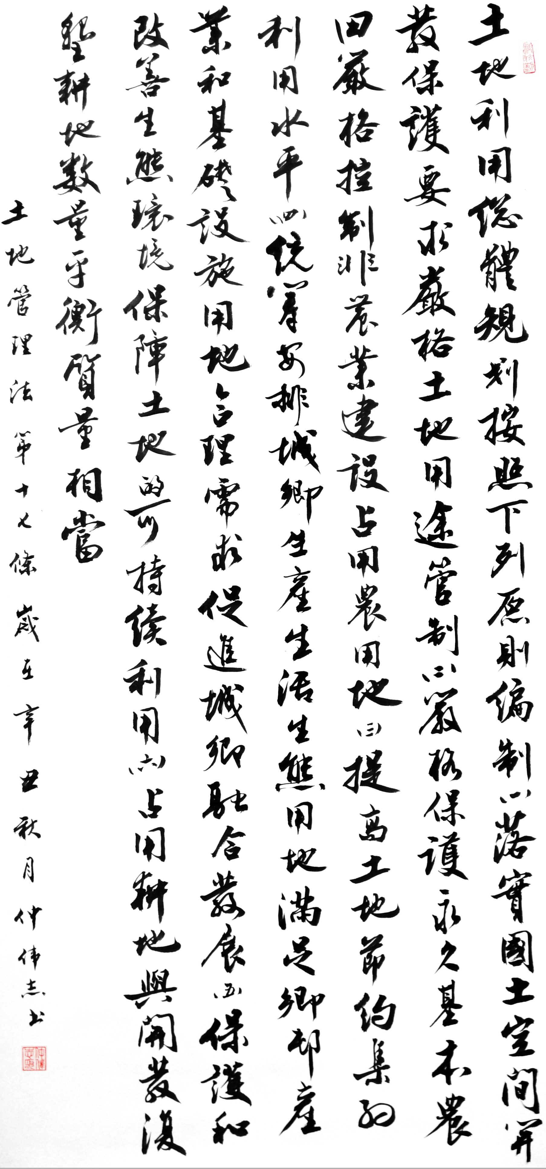 繼1600余位書法家參與書寫《中華人民共和國民法典》全部1260條法條之后,法治日報(bào)社聯(lián)合自然資源部法規(guī)司、自然資源部書畫研究會和北京昌平書法家協(xié)會,將筆端對準(zhǔn)土地管理“一法一條例”,即《中華人民共和國土地管理法》和《中華人民共和國土地管理法實(shí)施條例》。