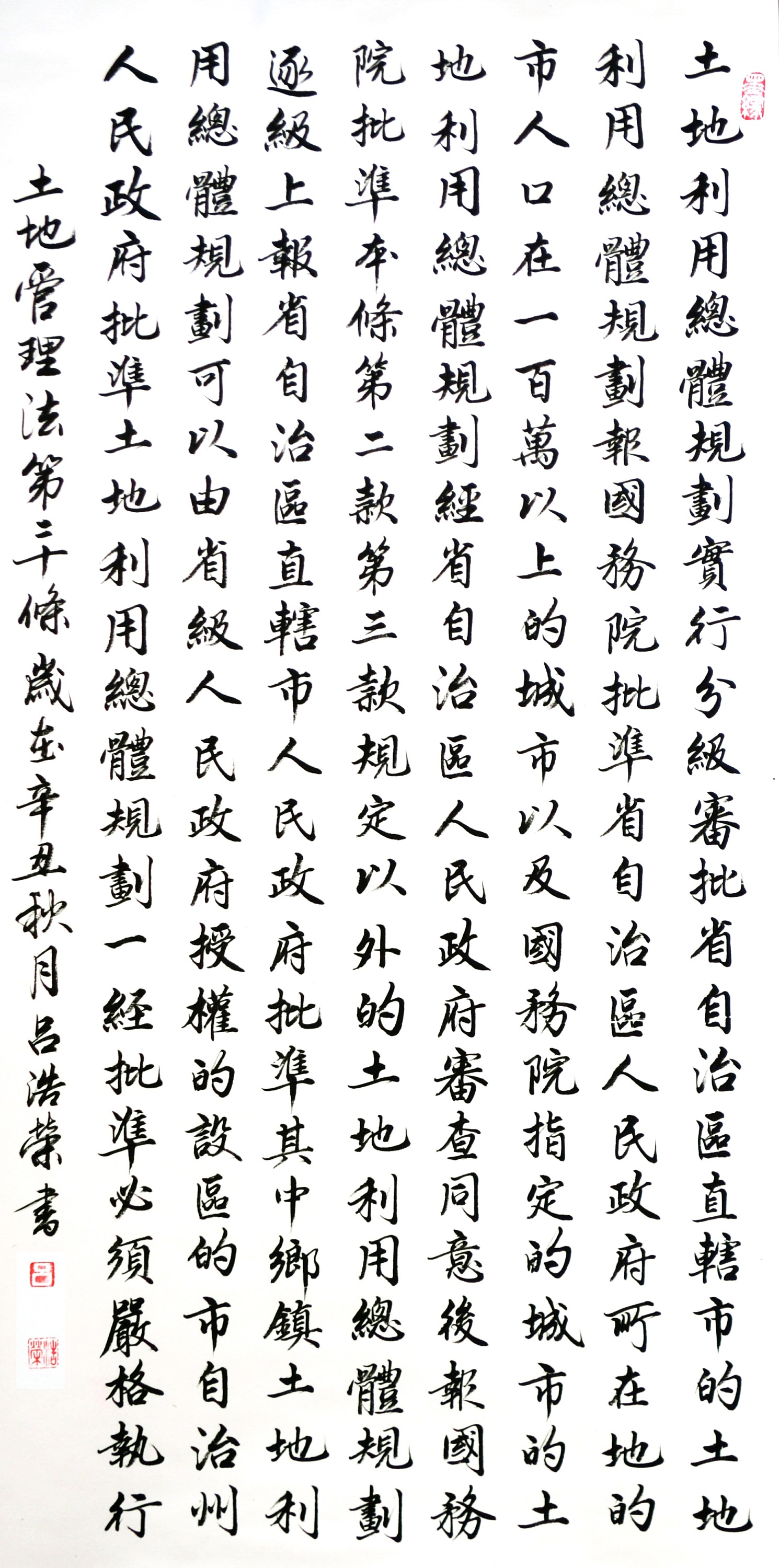 繼1600余位書法家參與書寫《中華人民共和國民法典》全部1260條法條之后,法治日報社聯(lián)合自然資源部法規(guī)司、自然資源部書畫研究會和北京昌平書法家協(xié)會,將筆端對準(zhǔn)土地管理“一法一條例”,即《中華人民共和國土地管理法》和《中華人民共和國土地管理法實施條例》。
