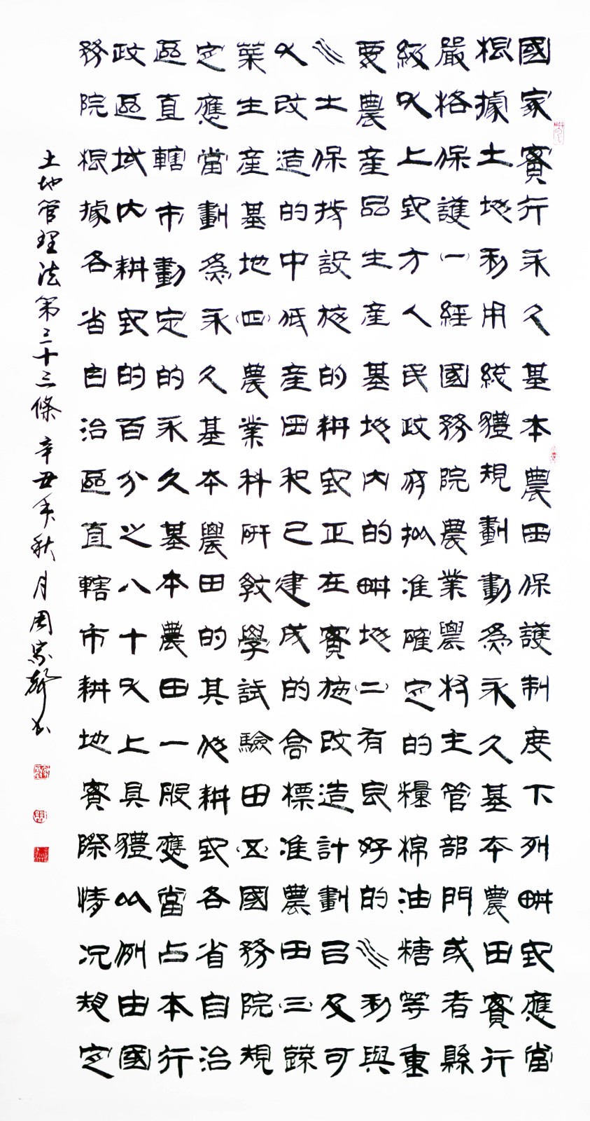 繼1600余位書法家參與書寫《中華人民共和國民法典》全部1260條法條之后,法治日報社聯(lián)合自然資源部法規(guī)司、自然資源部書畫研究會和北京昌平書法家協(xié)會,將筆端對準土地管理“一法一條例”,即《中華人民共和國土地管理法》和《中華人民共和國土地管理法實施條例》。