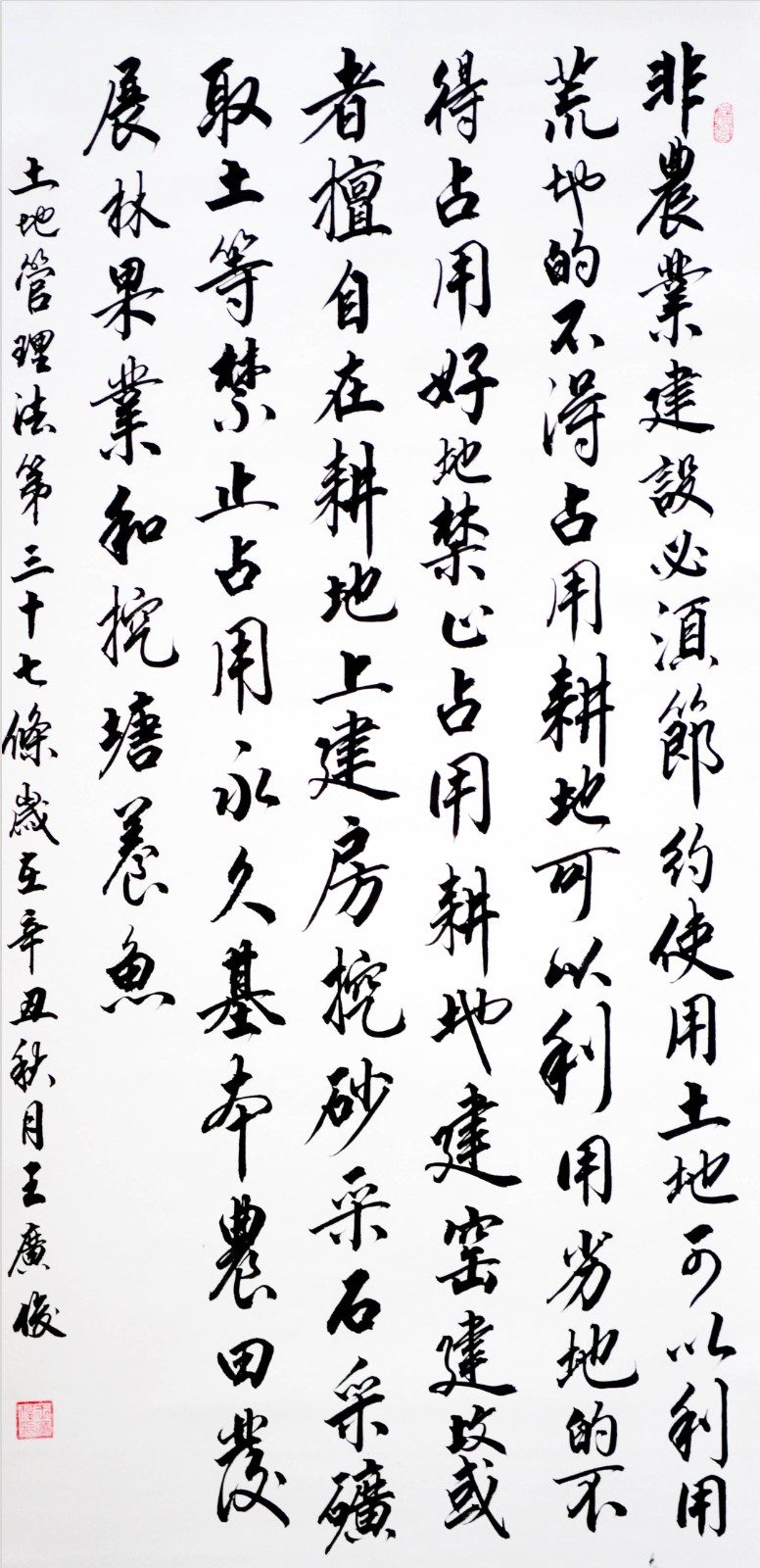 繼1600余位書法家參與書寫《中華人民共和國民法典》全部1260條法條之后,法治日報社聯(lián)合自然資源部法規(guī)司、自然資源部書畫研究會和北京昌平書法家協(xié)會,將筆端對準土地管理“一法一條例”,即《中華人民共和國土地管理法》和《中華人民共和國土地管理法實施條例》。