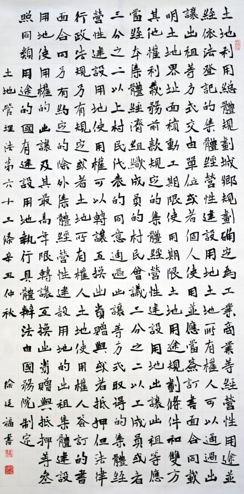繼1600余位書法家參與書寫《中華人民共和國民法典》全部1260條法條之后,法治日報(bào)社聯(lián)合自然資源部法規(guī)司、自然資源部書畫研究會和北京昌平書法家協(xié)會,將筆端對準(zhǔn)土地管理“一法一條例”,即《中華人民共和國土地管理法》和《中華人民共和國土地管理法實(shí)施條例》。