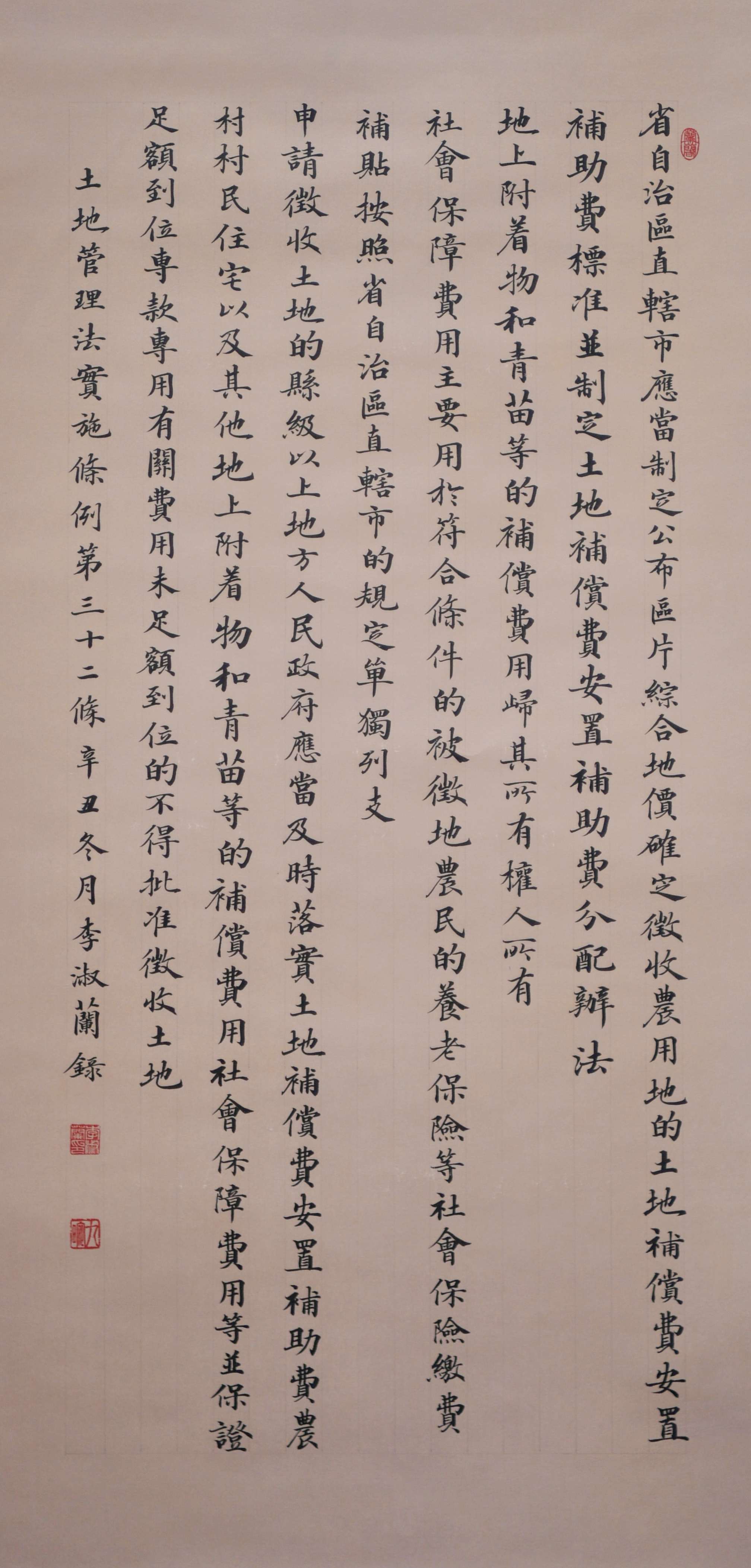 繼1600余位書法家參與書寫《中華人民共和國民法典》全部1260條法條之后,法治日?qǐng)?bào)社聯(lián)合自然資源部法規(guī)司、自然資源部書畫研究會(huì)和北京昌平書法家協(xié)會(huì),將筆端對(duì)準(zhǔn)土地管理“一法一條例”,即《中華人民共和國土地管理法》和《中華人民共和國土地管理法實(shí)施條例》。