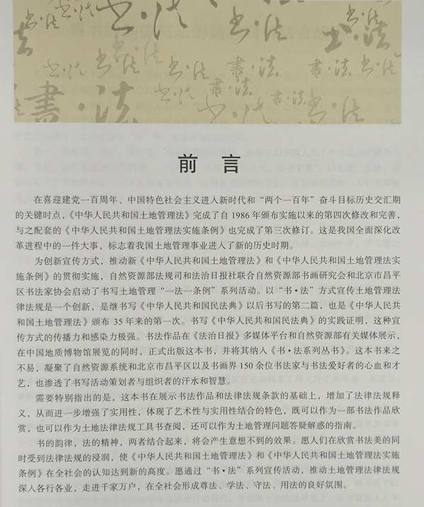 書以馭字,法以興邦;書法一體,墨法同彰。本書既可以作為一部書法作品欣賞,也可以作為土地法律法規(guī)工具書查閱,還可以作為土地管理問(wèn)題答疑解惑的指南。希望這套叢書可以讓讀者在欣賞書法美的同時(shí)受到法律法規(guī)的浸潤(rùn),推動(dòng)土地管理法律法規(guī)深入各行各業(yè)、走進(jìn)千家萬(wàn)戶,在全社會(huì)形成尊法、學(xué)法、守法、用法的良好氛圍。