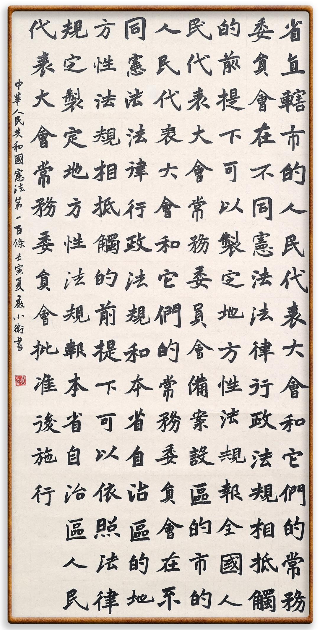 繼《中華人民共和國民法典》《中華人民共和國土地管理法》《中華人民共和國土地管理法實(shí)施條例》《中華人民共和國法律援助法》之后,法治日?qǐng)?bào)社聯(lián)合北京市司法局、北京書法家協(xié)會(huì),將筆端對(duì)準(zhǔn)《中華人民共和國憲法》和《中華人民共和國行政處罰法》。