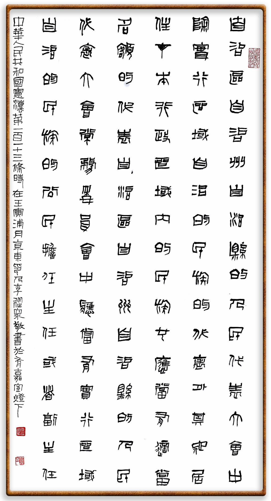 繼《中華人民共和國民法典》《中華人民共和國土地管理法》《中華人民共和國土地管理法實施條例》《中華人民共和國法律援助法》之后,法治日報社聯(lián)合北京市司法局、北京書法家協(xié)會,將筆端對準《中華人民共和國憲法》和《中華人民共和國行政處罰法》。