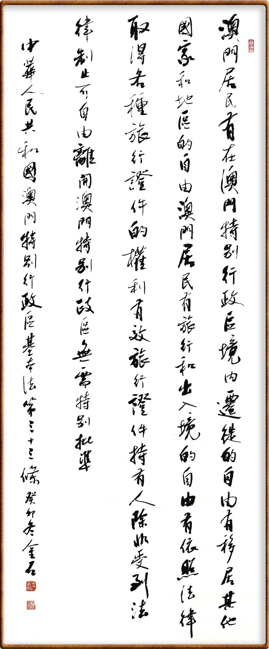 澳門基本法第三十三條 澳門居民有在澳門特別行政區(qū)境內遷徙的自由,有移居其他國家和地區(qū)的自由。澳門居民有旅行和出入境的自由,有依照法律取得各種旅行證件的權利。有效旅行證件持有人,除非受到法律制止,可自由離開澳門特別行政區(qū),無需特別批準。