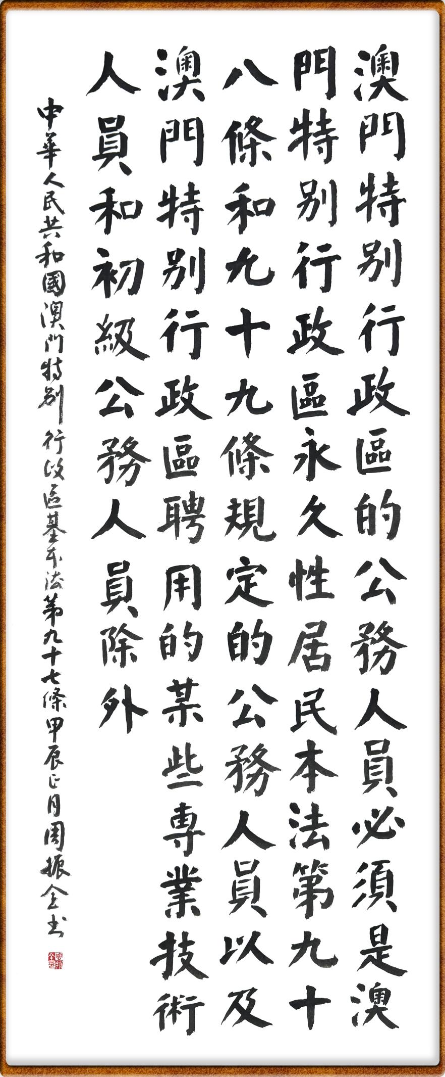 澳門基本法第九十七條 澳門特別行政區(qū)的公務人員必須是澳門特別行政區(qū)永久性居民。本法第九十八條和九十九條規(guī)定的公務人員,以及澳門特別行政區(qū)聘用的某些專業(yè)技術人員和初級公務人員除外。