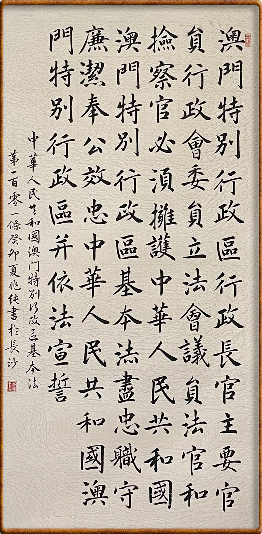 澳門基本法第一百零一條 澳門特別行政區(qū)行政長官、主要官員、行政會(huì)委員、立法會(huì)議員、法官和檢察官,必須擁護(hù)中華人民共和國澳門特別行政區(qū)基本法,盡忠職守,廉潔奉公,效忠中華人民共和國澳門特別行政區(qū),并依法宣誓。