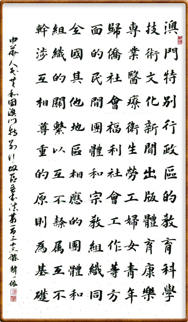澳門基本法第一百三十三條 澳門特別行政區(qū)的教育、科學(xué)、技術(shù)、文化、新聞、出版、體育、康樂、專業(yè)、醫(yī)療衛(wèi)生、勞工、婦女、青年、歸僑、社會福利、社會工作等方面的民間團(tuán)體和宗教組織同全國其他地區(qū)相應(yīng)的團(tuán)體和組織的關(guān)系,以互不隸屬、互不干涉、互相尊重的原則為基礎(chǔ)。
