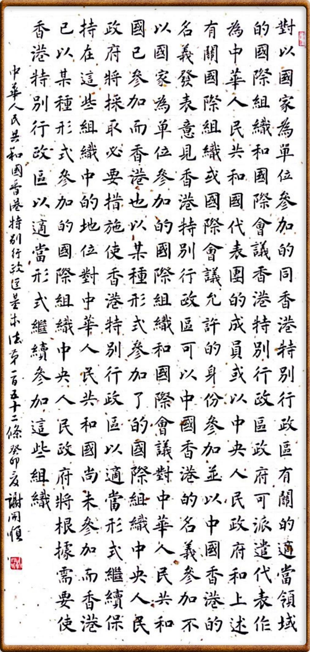 對(duì)中華人民共和國(guó)已參加而香港也以某種形式參加了的國(guó)際組織,中央人民政府將采取必要措施使香港特別行政區(qū)以適當(dāng)形式繼續(xù)保持在這些組織中的地位。