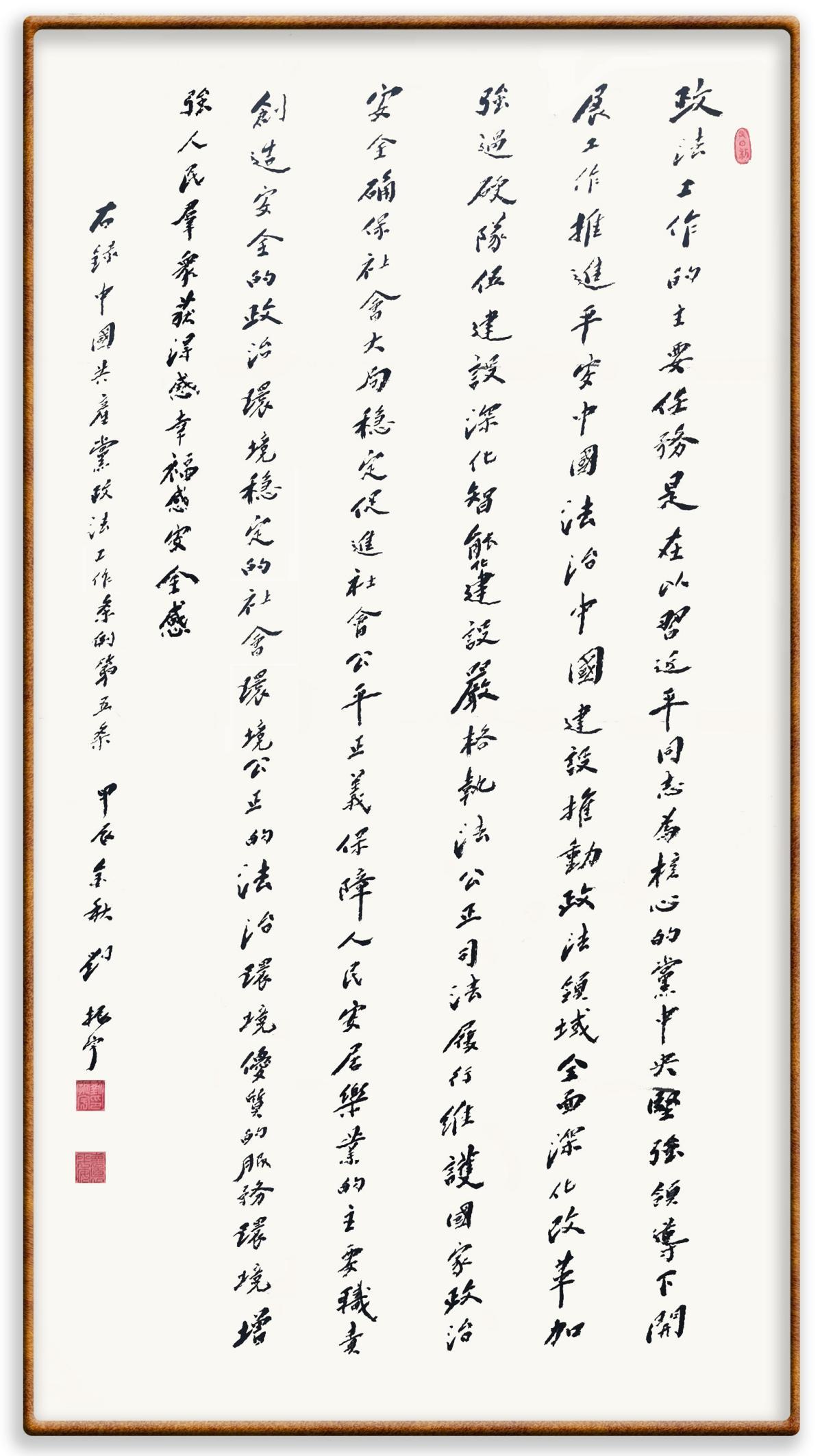 《中國共產黨政法工作條例》對黨領導新時代政法工作進行全面制度擘畫,為黨領導政法工作提供基本遵循,具有重大而深遠的意義。為學習好、宣傳好、貫徹好、實施好這部黨內法規(guī),繼《中華人民共和國民法典》《中華人民共和國憲法》《信訪工作條例》《中華人民共和國澳門特別行政區(qū)基本法》《中華人民共和國香港特別行政區(qū)基本法》等法律法規(guī)之后,“書·法”系列活動將筆端對準《中國共產黨政法工作條例》。