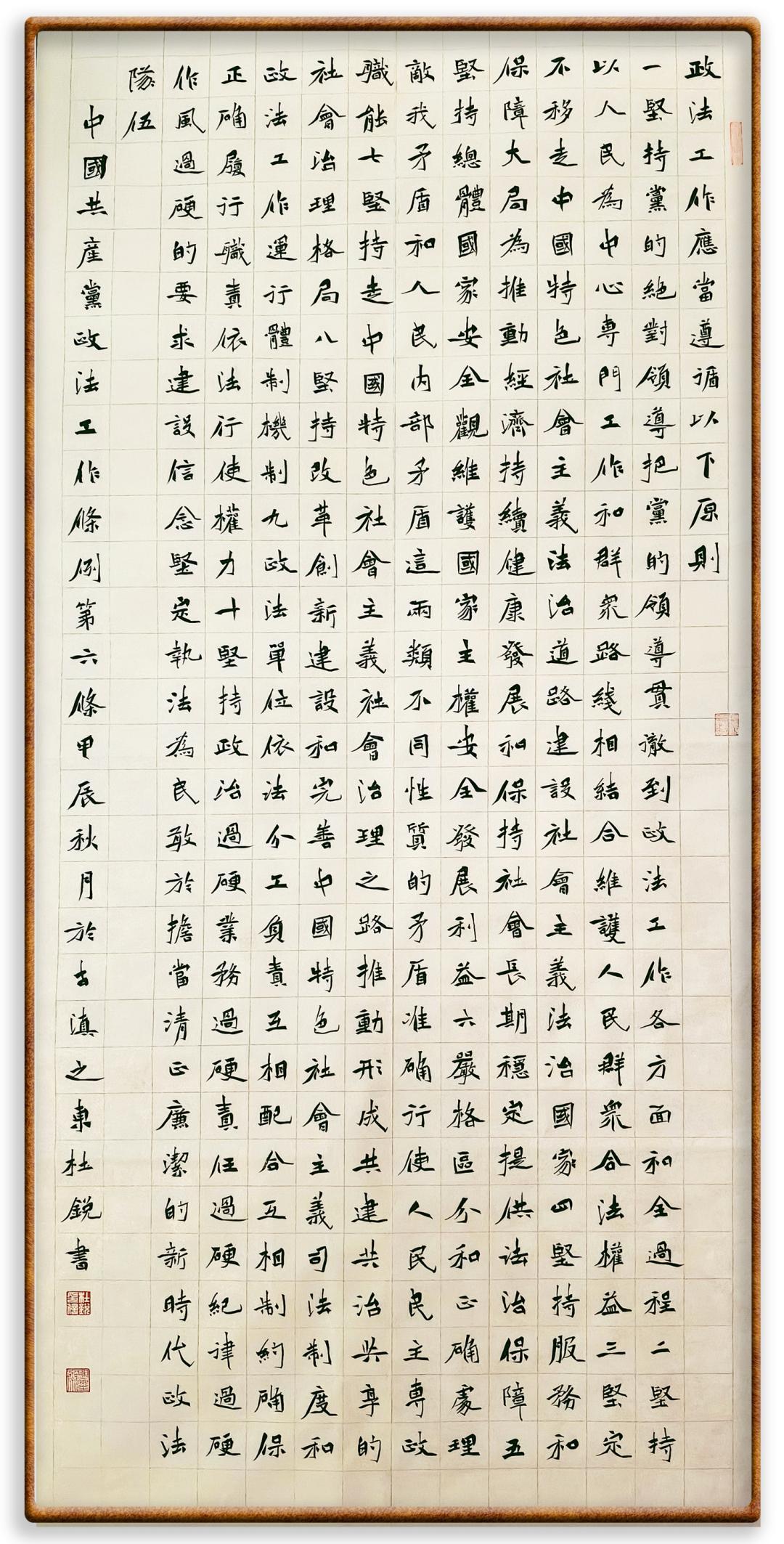 《中國共產(chǎn)黨政法工作條例》對黨領(lǐng)導(dǎo)新時代政法工作進(jìn)行全面制度擘畫,為黨領(lǐng)導(dǎo)政法工作提供基本遵循,具有重大而深遠(yuǎn)的意義。為學(xué)習(xí)好、宣傳好、貫徹好、實(shí)施好這部黨內(nèi)法規(guī),繼《中華人民共和國民法典》《中華人民共和國憲法》《信訪工作條例》《中華人民共和國澳門特別行政區(qū)基本法》《中華人民共和國香港特別行政區(qū)基本法》等法律法規(guī)之后,“書·法”系列活動將筆端對準(zhǔn)《中國共產(chǎn)黨政法工作條例》。