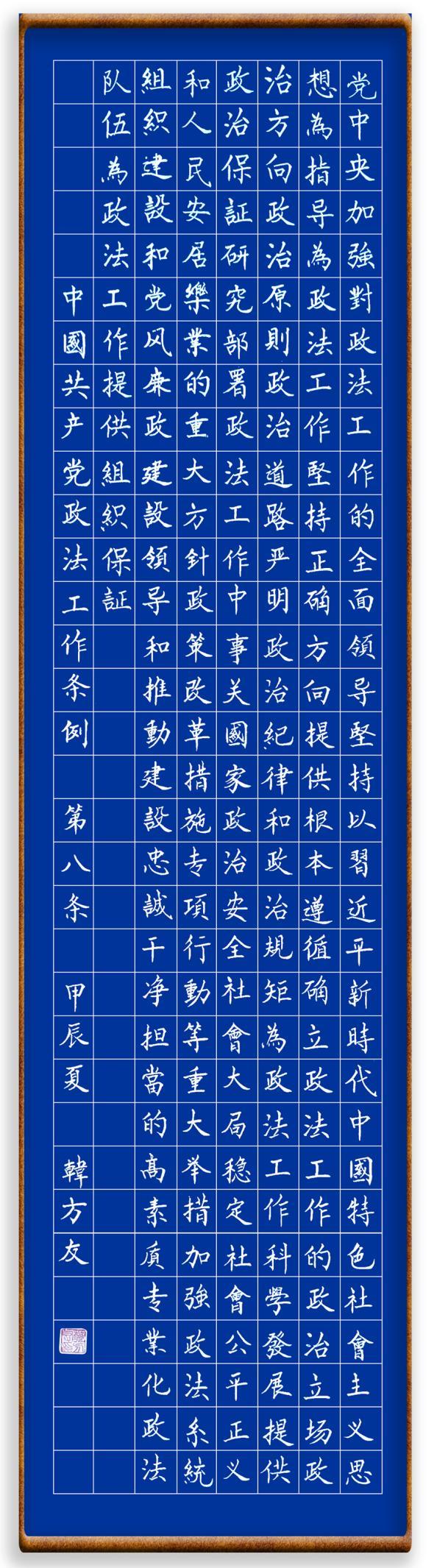 《中國共產(chǎn)黨政法工作條例》對黨領(lǐng)導新時代政法工作進行全面制度擘畫,為黨領(lǐng)導政法工作提供基本遵循,具有重大而深遠的意義。為學習好、宣傳好、貫徹好、實施好這部黨內(nèi)法規(guī),繼《中華人民共和國民法典》《中華人民共和國憲法》《信訪工作條例》《中華人民共和國澳門特別行政區(qū)基本法》《中華人民共和國香港特別行政區(qū)基本法》等法律法規(guī)之后,“書·法”系列活動將筆端對準《中國共產(chǎn)黨政法工作條例》。