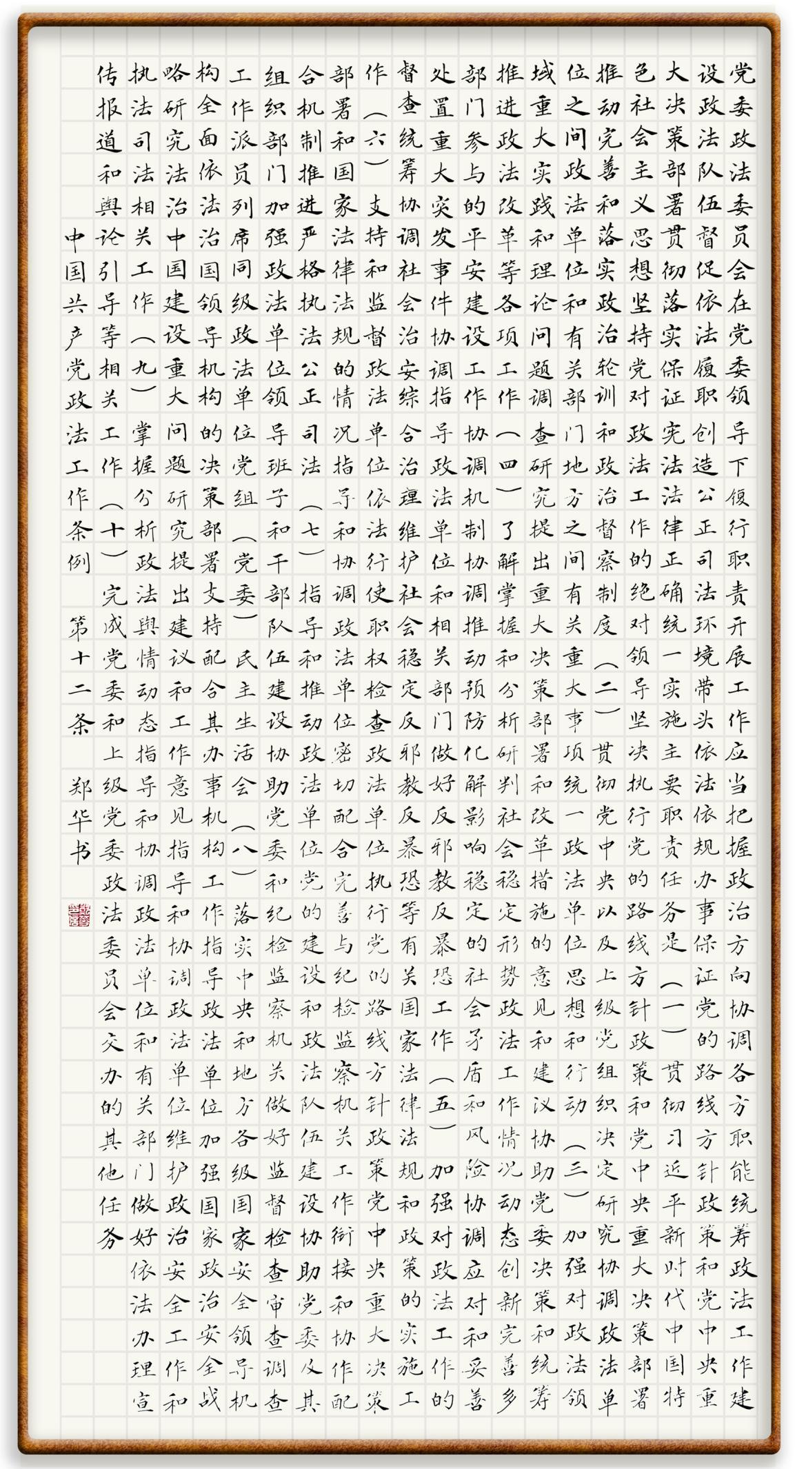 《中國(guó)共產(chǎn)黨政法工作條例》對(duì)黨領(lǐng)導(dǎo)新時(shí)代政法工作進(jìn)行全面制度擘畫,為黨領(lǐng)導(dǎo)政法工作提供基本遵循,具有重大而深遠(yuǎn)的意義。為學(xué)習(xí)好、宣傳好、貫徹好、實(shí)施好這部黨內(nèi)法規(guī),繼《中華人民共和國(guó)民法典》《中華人民共和國(guó)憲法》《信訪工作條例》《中華人民共和國(guó)澳門特別行政區(qū)基本法》《中華人民共和國(guó)香港特別行政區(qū)基本法》等法律法規(guī)之后,“書·法”系列活動(dòng)將筆端對(duì)準(zhǔn)《中國(guó)共產(chǎn)黨政法工作條例》。