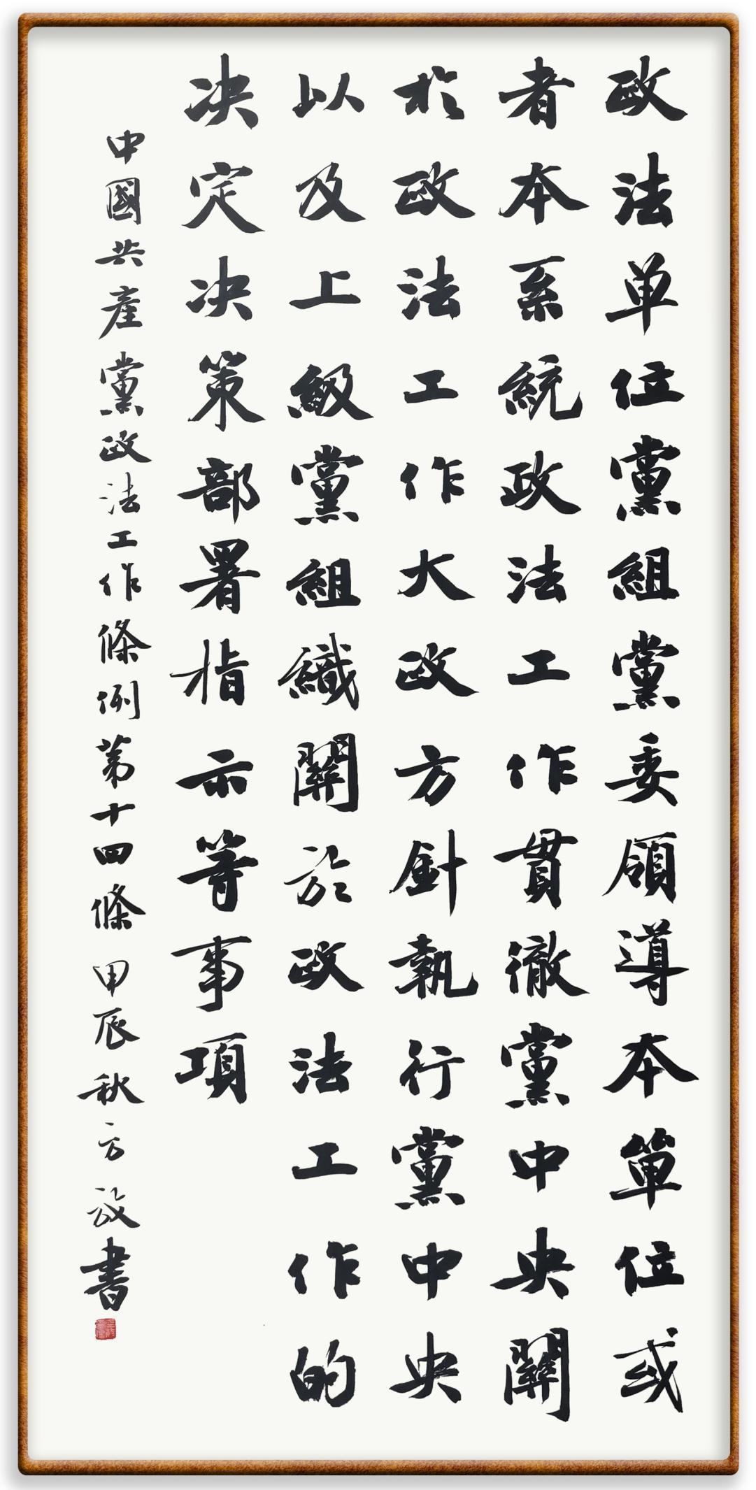 《中國共產(chǎn)黨政法工作條例》對黨領導新時代政法工作進行全面制度擘畫,為黨領導政法工作提供基本遵循,具有重大而深遠的意義。為學習好、宣傳好、貫徹好、實施好這部黨內(nèi)法規(guī),繼《中華人民共和國民法典》《中華人民共和國憲法》《信訪工作條例》《中華人民共和國澳門特別行政區(qū)基本法》《中華人民共和國香港特別行政區(qū)基本法》等法律法規(guī)之后,“書·法”系列活動將筆端對準《中國共產(chǎn)黨政法工作條例》。