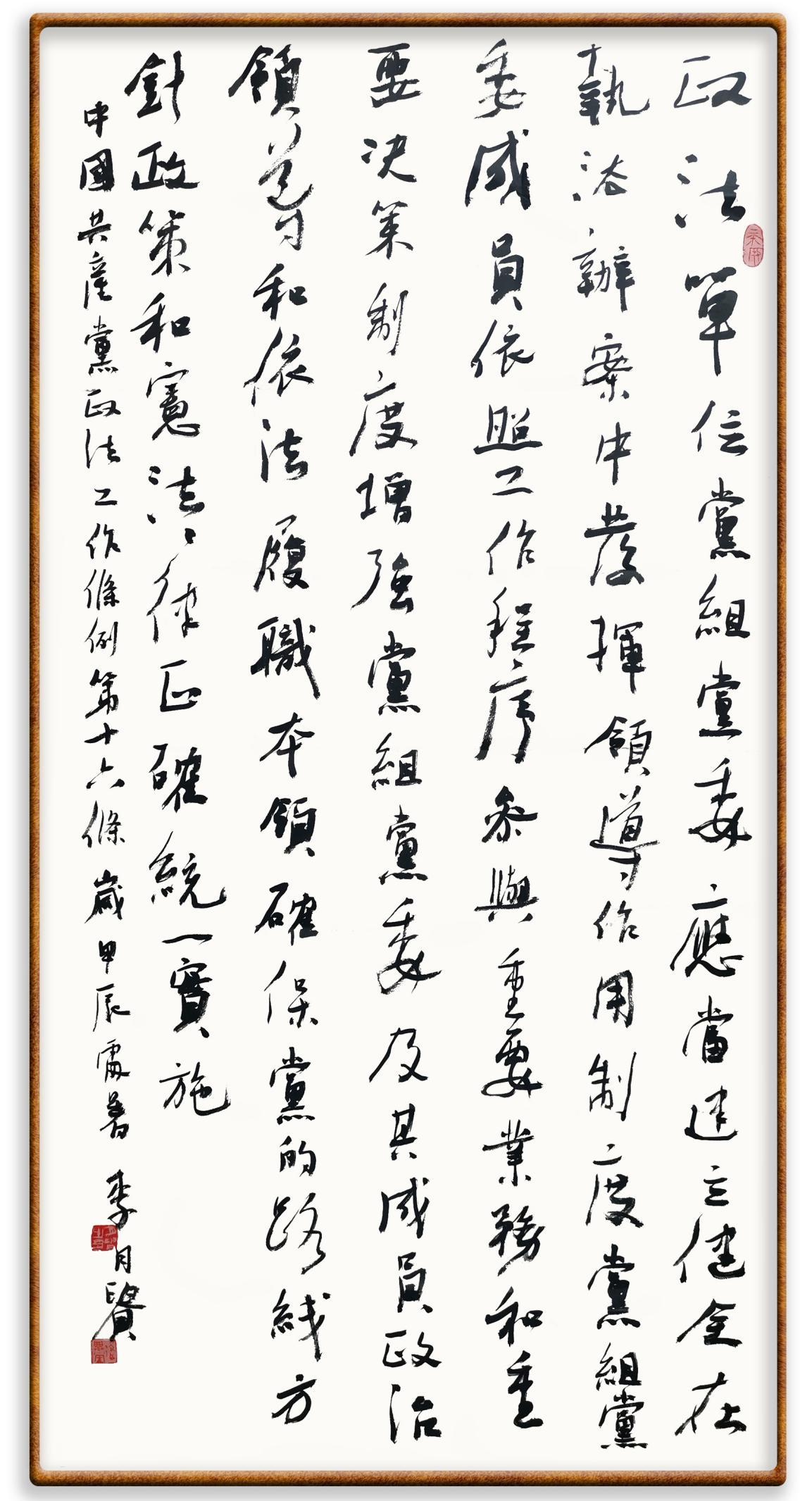 《中國(guó)共產(chǎn)黨政法工作條例》對(duì)黨領(lǐng)導(dǎo)新時(shí)代政法工作進(jìn)行全面制度擘畫(huà),為黨領(lǐng)導(dǎo)政法工作提供基本遵循,具有重大而深遠(yuǎn)的意義。為學(xué)習(xí)好、宣傳好、貫徹好、實(shí)施好這部黨內(nèi)法規(guī),繼《中華人民共和國(guó)民法典》《中華人民共和國(guó)憲法》《信訪工作條例》《中華人民共和國(guó)澳門(mén)特別行政區(qū)基本法》《中華人民共和國(guó)香港特別行政區(qū)基本法》等法律法規(guī)之后,“書(shū)·法”系列活動(dòng)將筆端對(duì)準(zhǔn)《中國(guó)共產(chǎn)黨政法工作條例》。