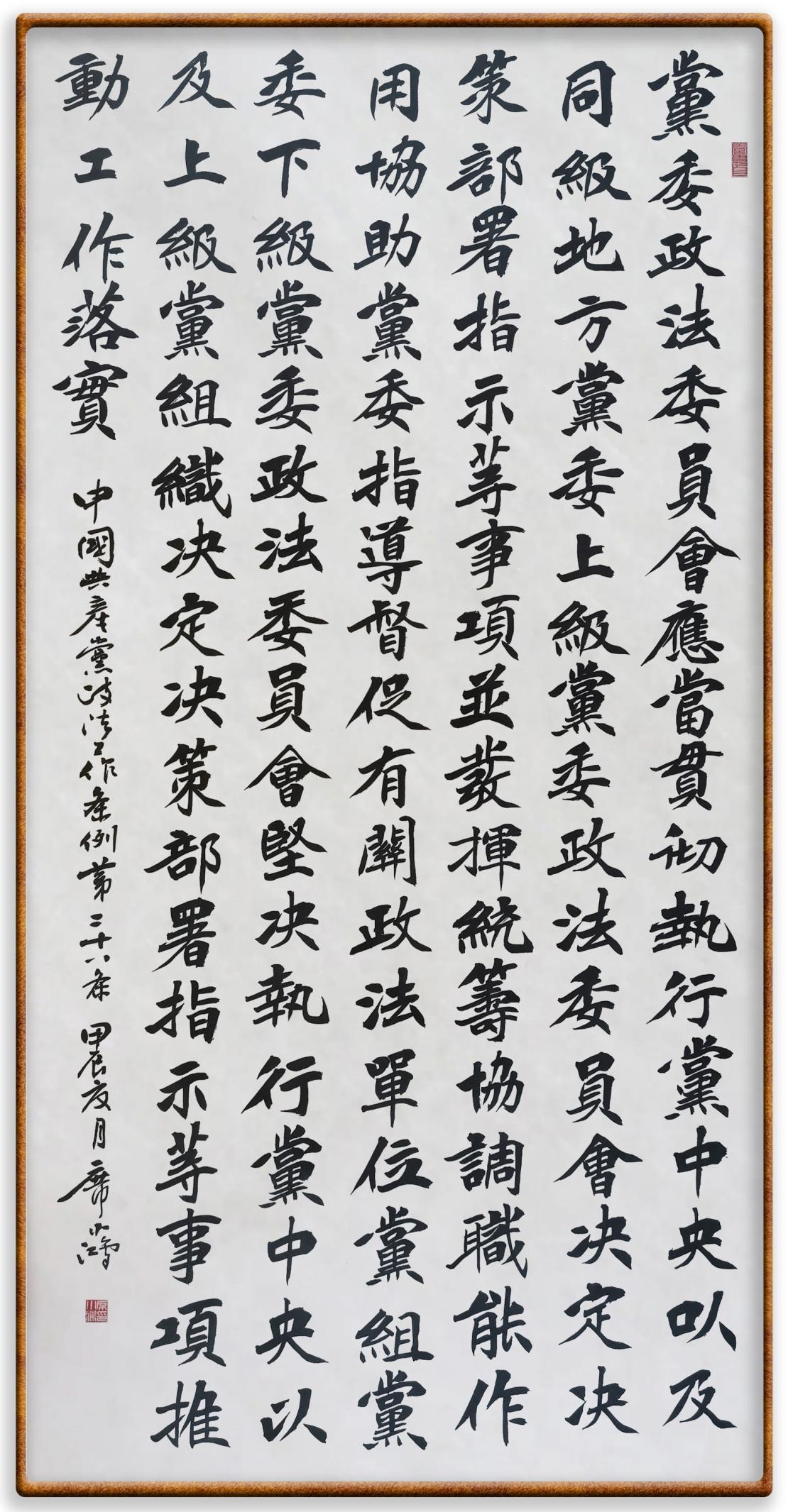 《中國(guó)共產(chǎn)黨政法工作條例》對(duì)黨領(lǐng)導(dǎo)新時(shí)代政法工作進(jìn)行全面制度擘畫(huà),為黨領(lǐng)導(dǎo)政法工作提供基本遵循,具有重大而深遠(yuǎn)的意義。為學(xué)習(xí)好、宣傳好、貫徹好、實(shí)施好這部黨內(nèi)法規(guī),繼《中華人民共和國(guó)民法典》《中華人民共和國(guó)憲法》《信訪工作條例》《中華人民共和國(guó)澳門(mén)特別行政區(qū)基本法》《中華人民共和國(guó)香港特別行政區(qū)基本法》等法律法規(guī)之后,“書(shū)·法”系列活動(dòng)將筆端對(duì)準(zhǔn)《中國(guó)共產(chǎn)黨政法工作條例》。